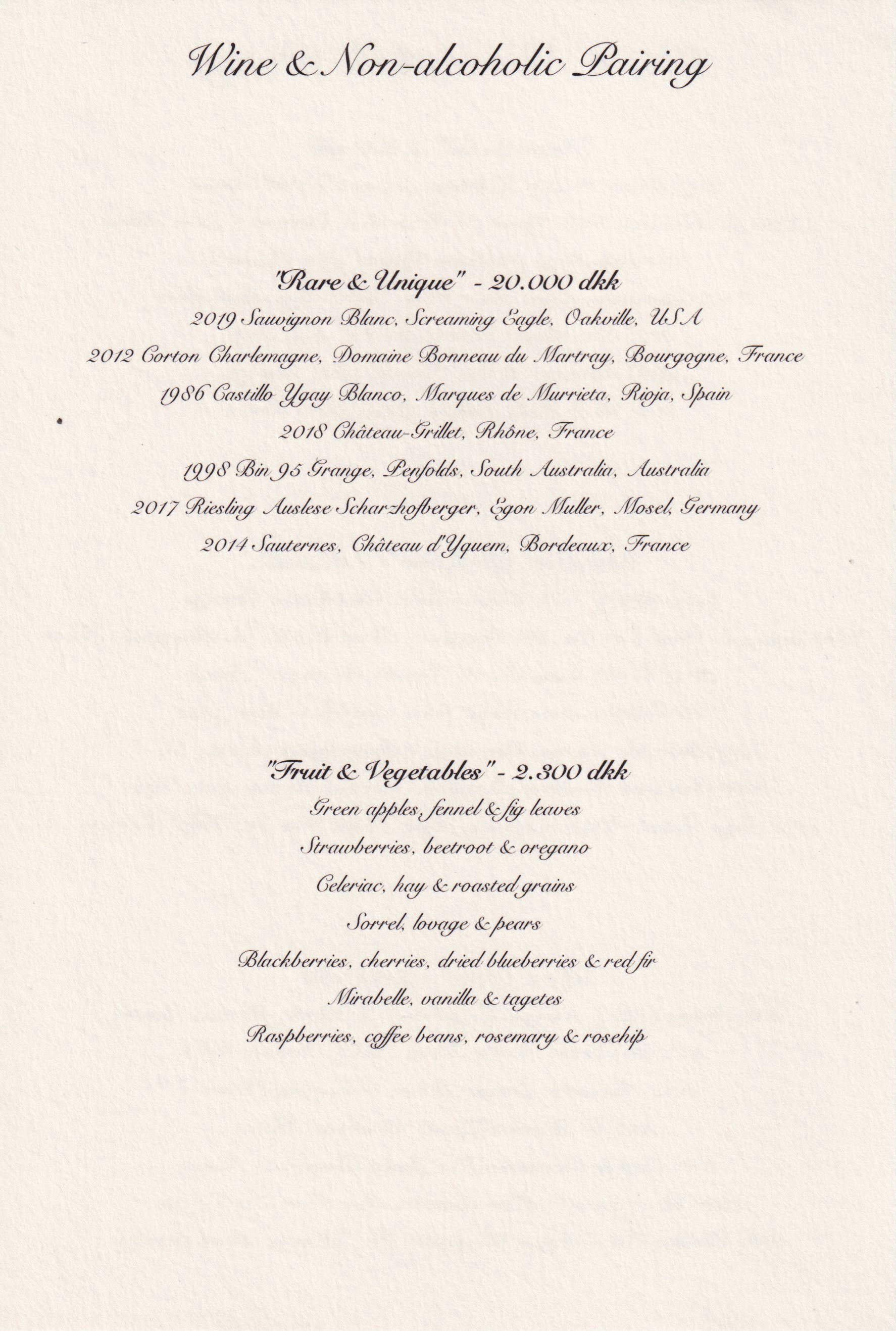 Cost per Person: Tasting menu 4200 DKK ($650), Wine pairing 2300-20000 DKK ($360-$3120)