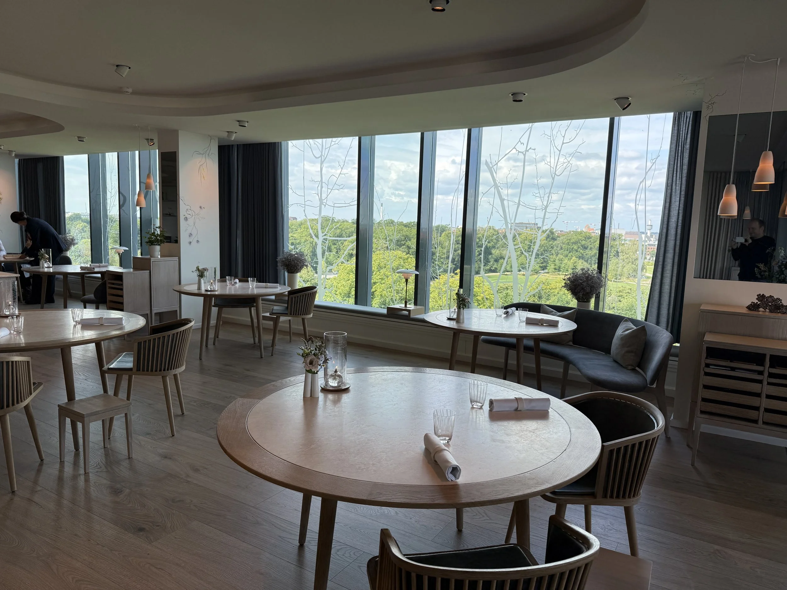 Copenhagen's “Geranium” was one of the first Scandinavian restaurants to receive three Michelin stars (even ahead of Noma, maybe the most famous restaurant in the region). Its location is unusual - it sits on the top floor of a soccer stadium, which can make for an interesting arrival or departure if a game is taking place at the same time. The view from the dining room is (unfortunately?) only towards a park next to the stadium, allowing guests to “see the change of the seasons” as trees turn green, golden or lose their leaves entirely. Only the prep kitchen has a view of the soccer field itself.