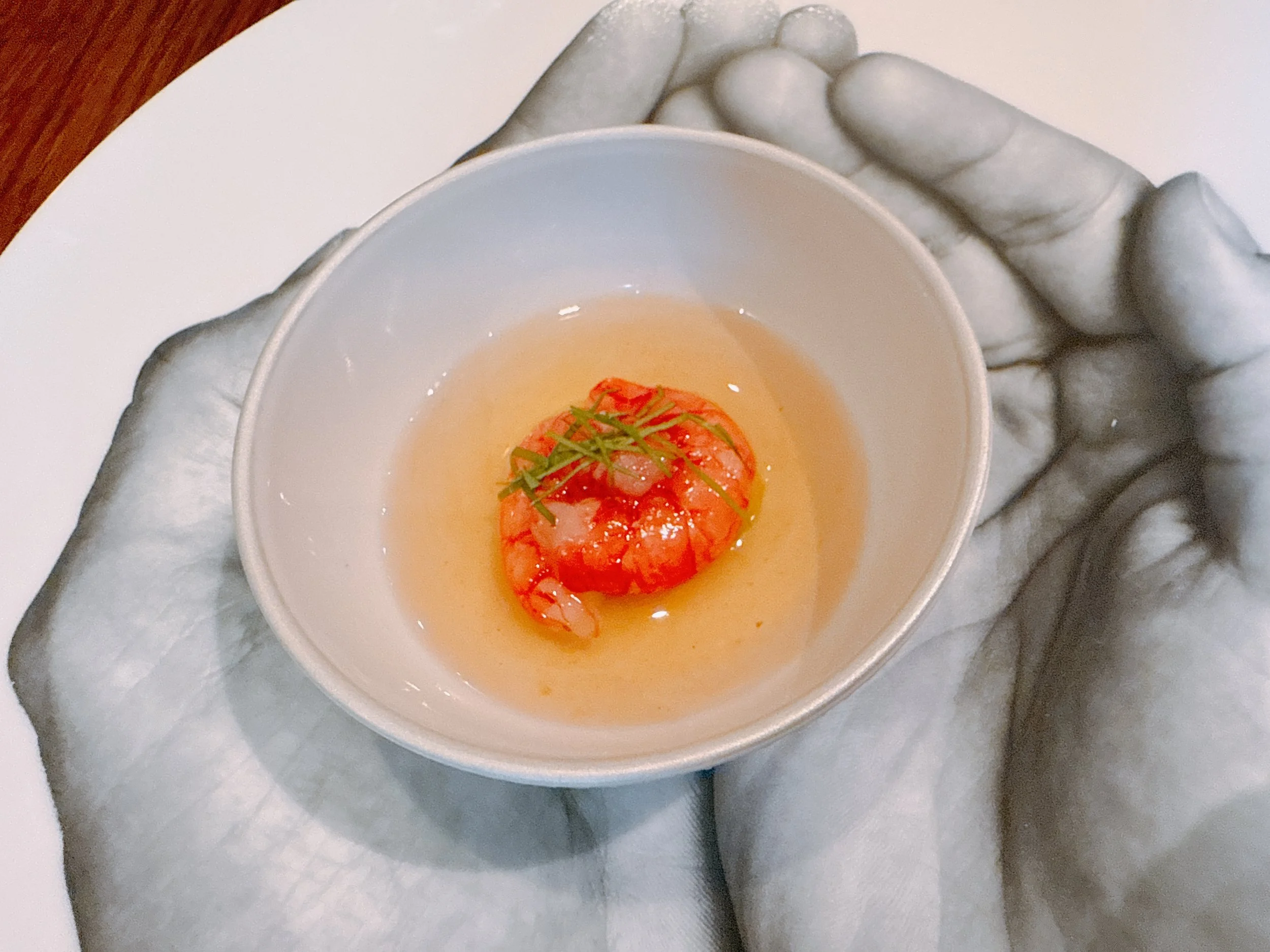 The first pair of appetizers focused on shrimp. One was a cold broth containing some gamba rosso (shrimp), sweet tomatoes and cucumber pearls. The shrimp tasted sweet and were of great quality, and the broth was reminiscent of a very flavorful tomato water soup. A very intense, and slightly fruity experience - a great start to our meal 19. Next to this came a cracker cup filled with amaebi shrimp and uni (sea urchin). This different variety of shrimp was also quite sweet, and the cup was nicely crunchy. The rest of the dish's filling was very (maybe too?) creamy. I couldn't detect the uni - it was probably hidden by the rest of the creamy filling. If this sounds overly negative, it's actually just nitpicking - the result was still very tasty. Another excellent dish, only a smidgen below the gamba rosso broth 19.
