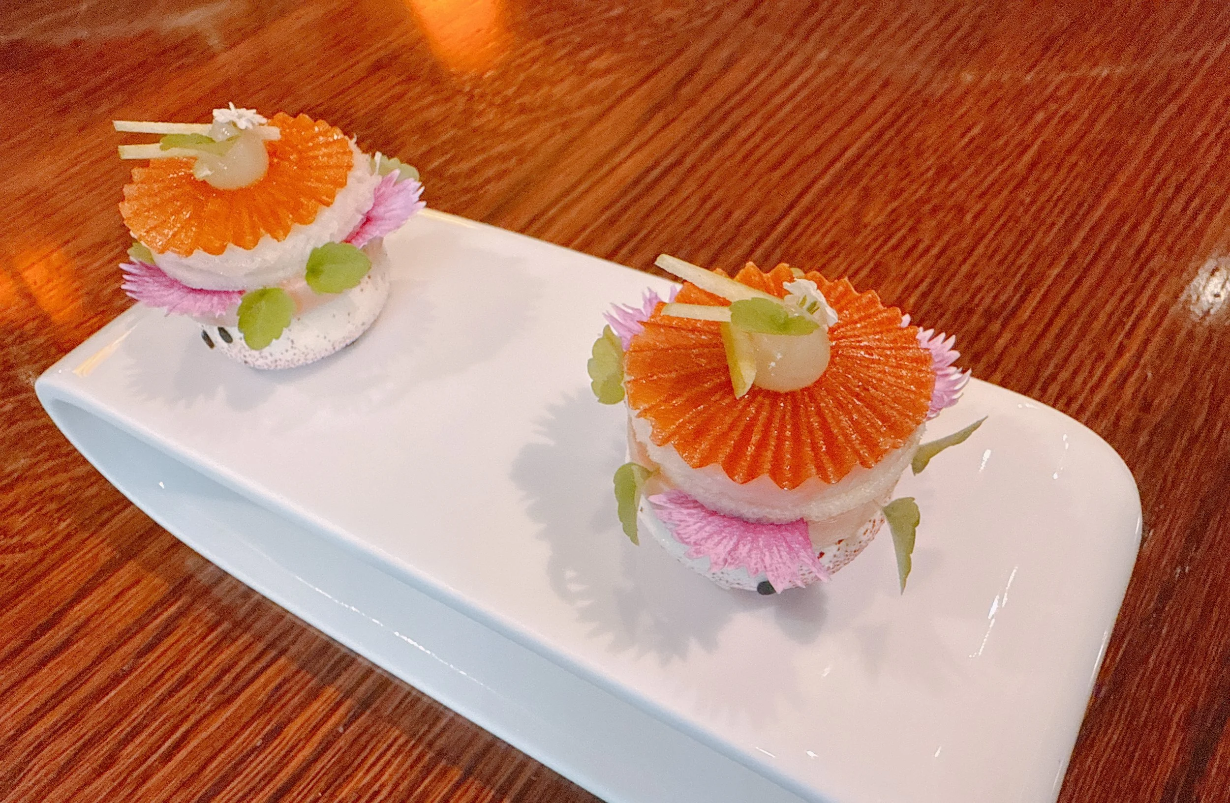 The next serving again consisted of two different dishes, this time without a common ingredient, but possibly following a similar color scheme (white, orange, green). Another cracker cup was filled with salmon belly, salmon roe, edamame and myoga ginger. The salmon was lovely, the ginger added more flavor, and the edamame provided some light crunch that contrasted with the cup's more pronounced texture. A bite that was full of flavor 18. The second dish was an apple macaroon topped with unagi (eel) and goose liver. This was a variation on a signature dish of Martin Berasategui’s eponymous three-star restaurant near San Sebastian. Even though it had liver as an ingredient, this was still a light bite. Crunch from the macaroon, creaminess from the liver, plus some smokiness that reminded me of bacon. Nice 18.