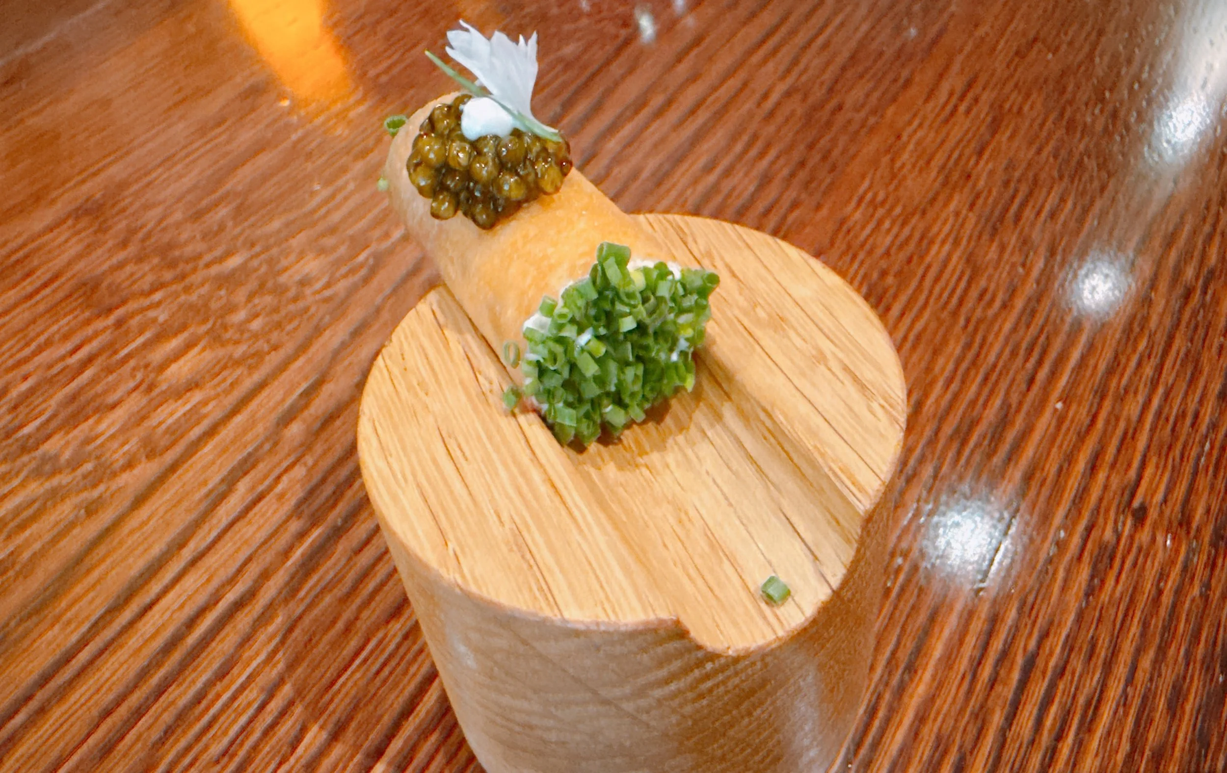On to the last two appetizers. A nori cracker tartlet was filled with koshihikari rice, hamachi, wasabi and a bit of caviar. Maybe a reconfigured version of a hamachi maki roll? The fish was of great quality, the rice fragrant and the nori added flavor and crispiness - wonderful 19. Finally, we received a cigar-shaped cracker filled with wagyu tartare, crème fraîche, chopped chives and (like many dishes in this menu) topped with a dollop of caviar. Creamy and salty with a smoky beef flavor - lovely 19. The pescatarian version of this dish used tuna instead of beef, and might have been a tiny bit better.