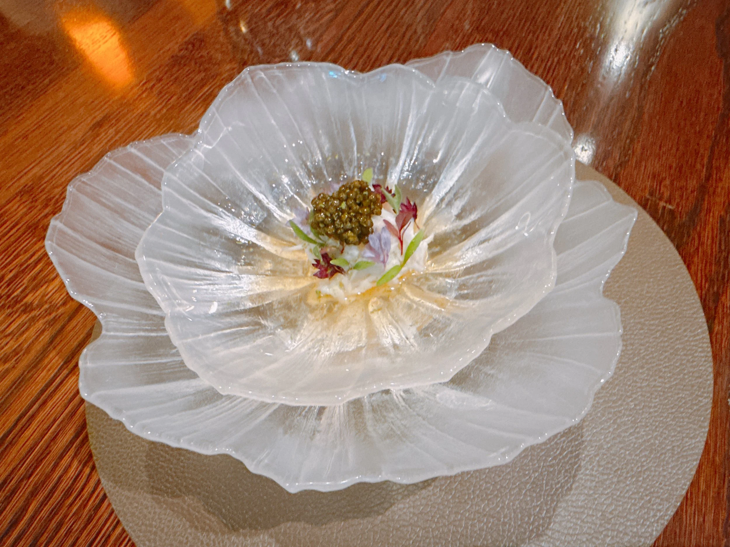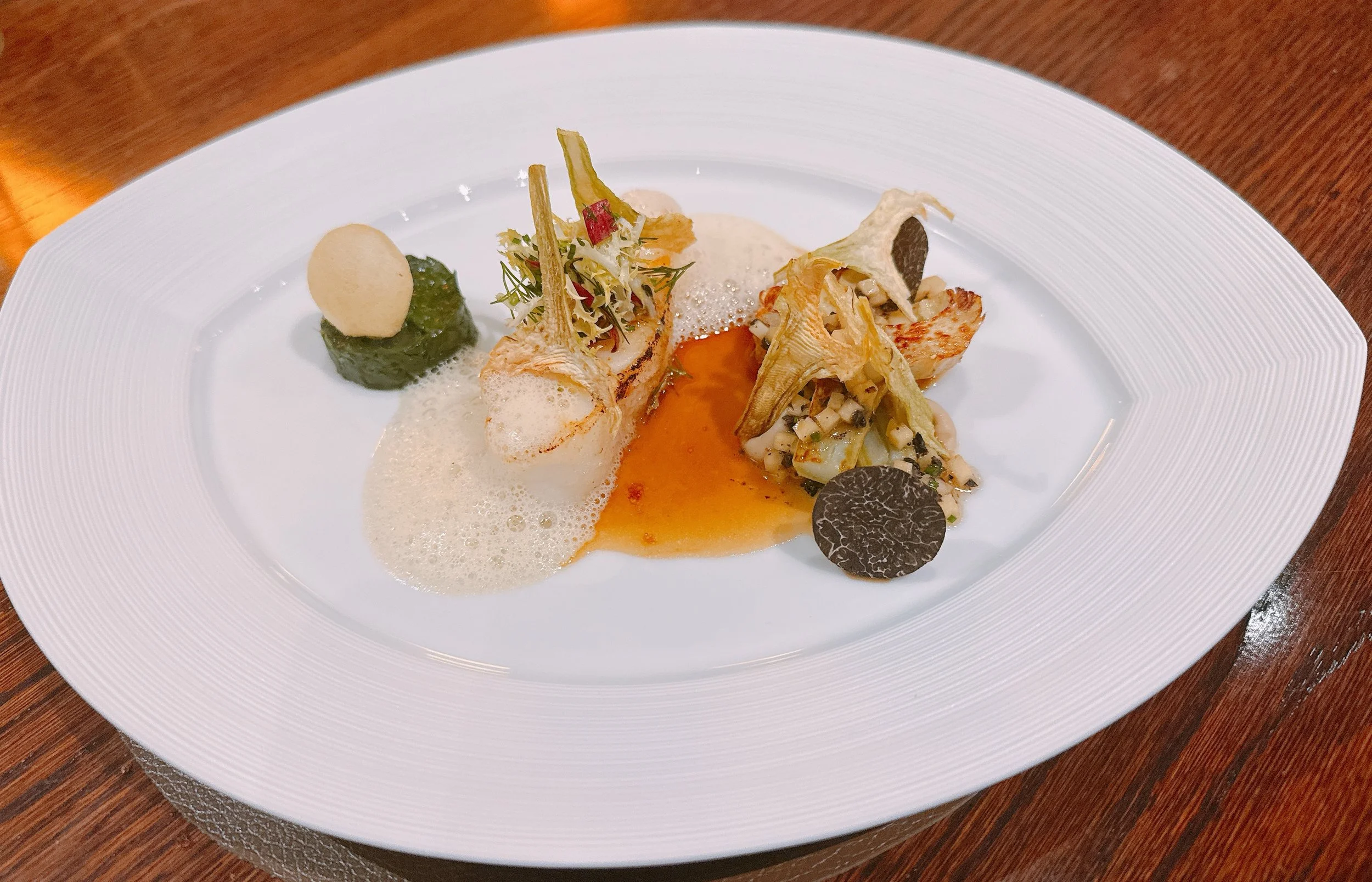 The following seven courses constituted the “main” part of the tasting menu, and each came with a paired wine. First up was a Norwegian king crab, lightly steamed, and served over soba noodles with Japanese citrus fruits. It came with some caviar and a “Kyoto dashi”. The dashi followed the recipe of a chef from Kyoto, getting reduced repeatedly for a very intense, citrusy flavor. The crab was excellent, the soba was lovely as well with a great texture, and the caviar added some saltiness to the dish. A fantastic combination 19.