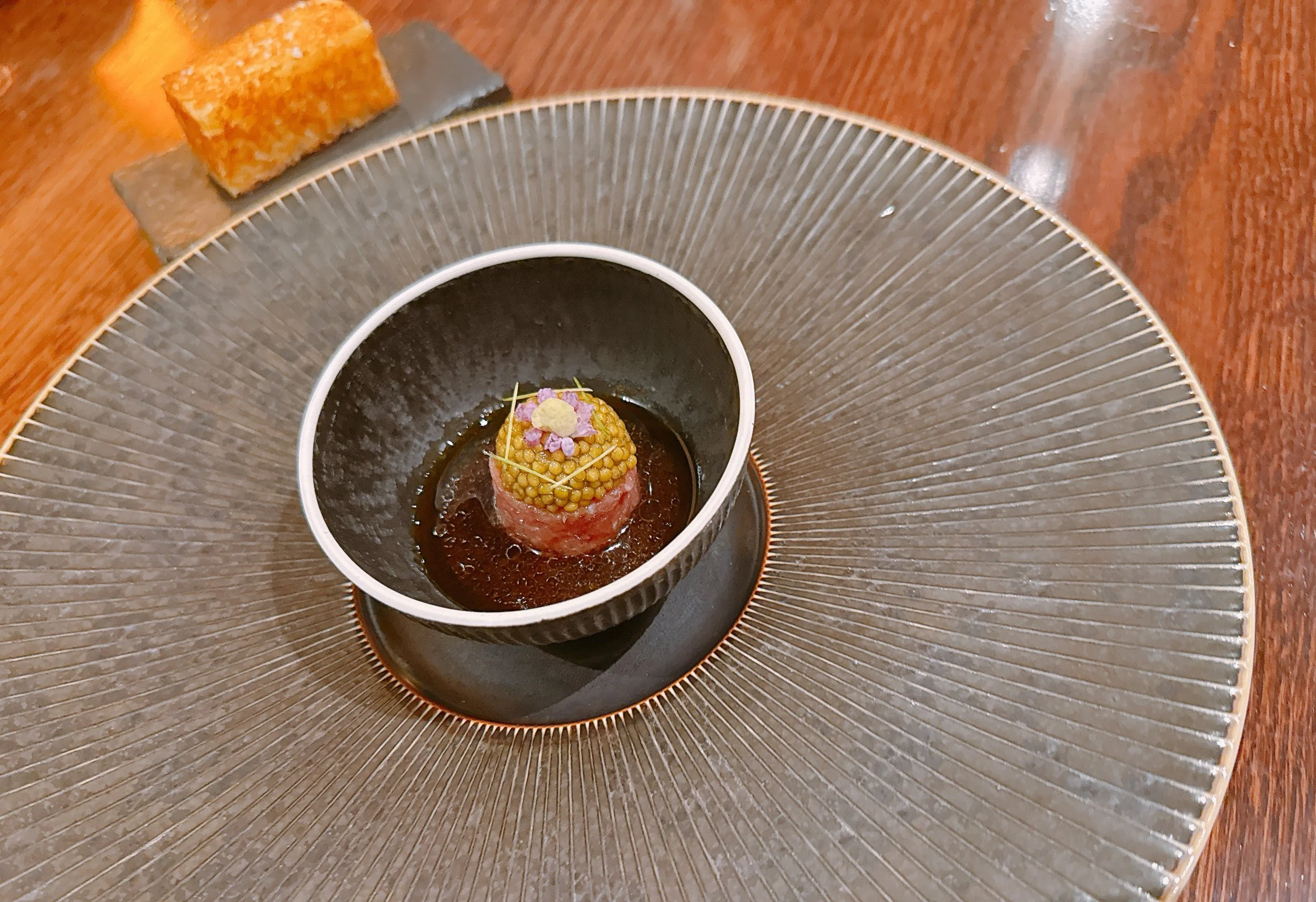 The following dish was not part of the regular tasting menu - we had ordered it off the “Specials” menu. Toro crudo was very finely chopped and was served with a slice of brioche, lots of caviar and a shoyu vinaigrette. The sauce was truly amazing: very rich and made with a high quality soy sauce, providing lots of umami. Together with the creamy tuna and the delicious caviar, this made for another terrific dish 19.