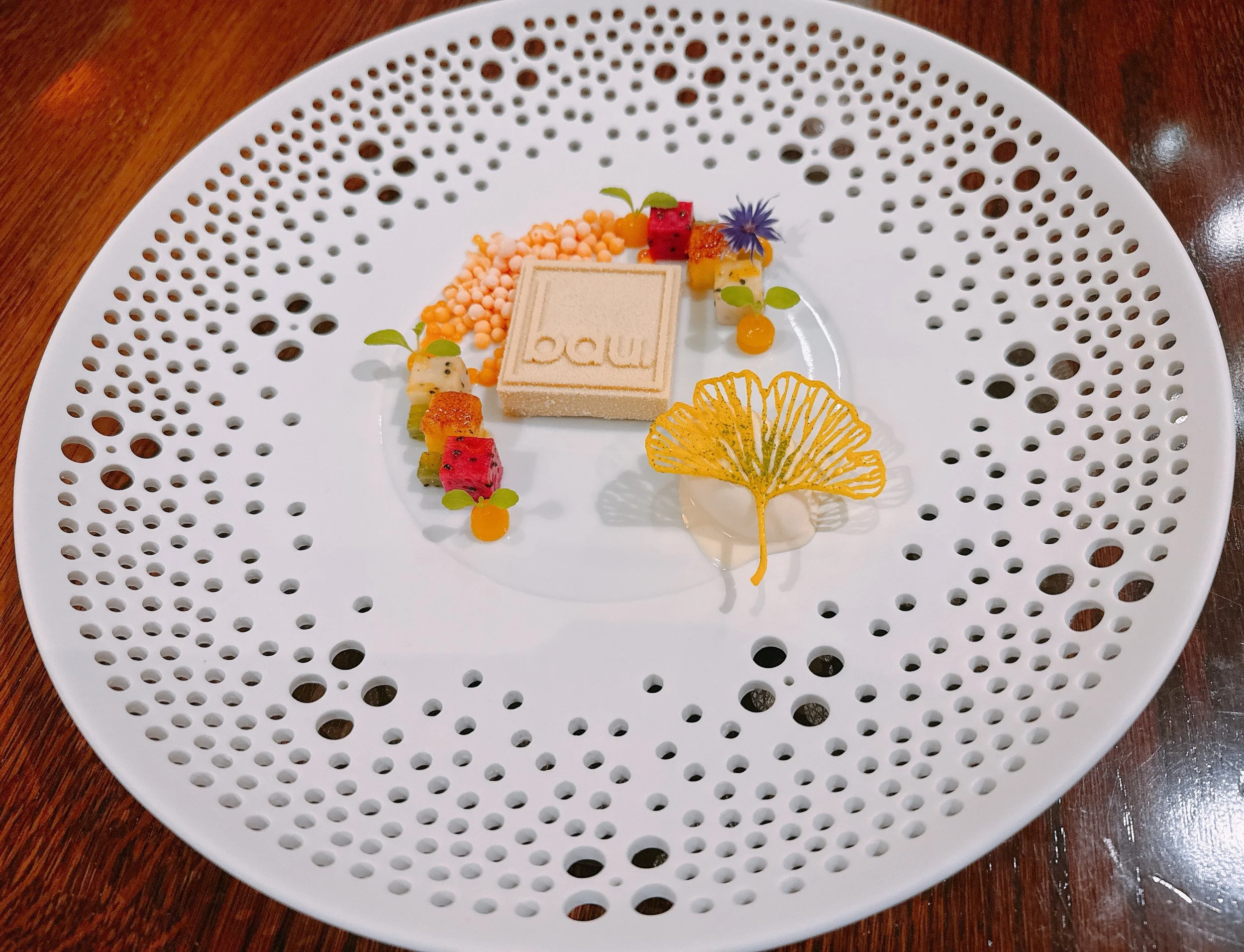 The main dessert featured a “Baustein”: literally translated a “building stone”, but also a play on chef Christian Bau's name. This little square's flavor was supposedly based on pandan, but mainly reminded me of a vanilla mousse. On the side were little cubes of exotic fruits: kiwi, dragon fruit, and caramelized pineapple, as well as a coconut-yuzu sorbet. A light, citrusy combination of flavors, and a wonderful way to end the meal 18.