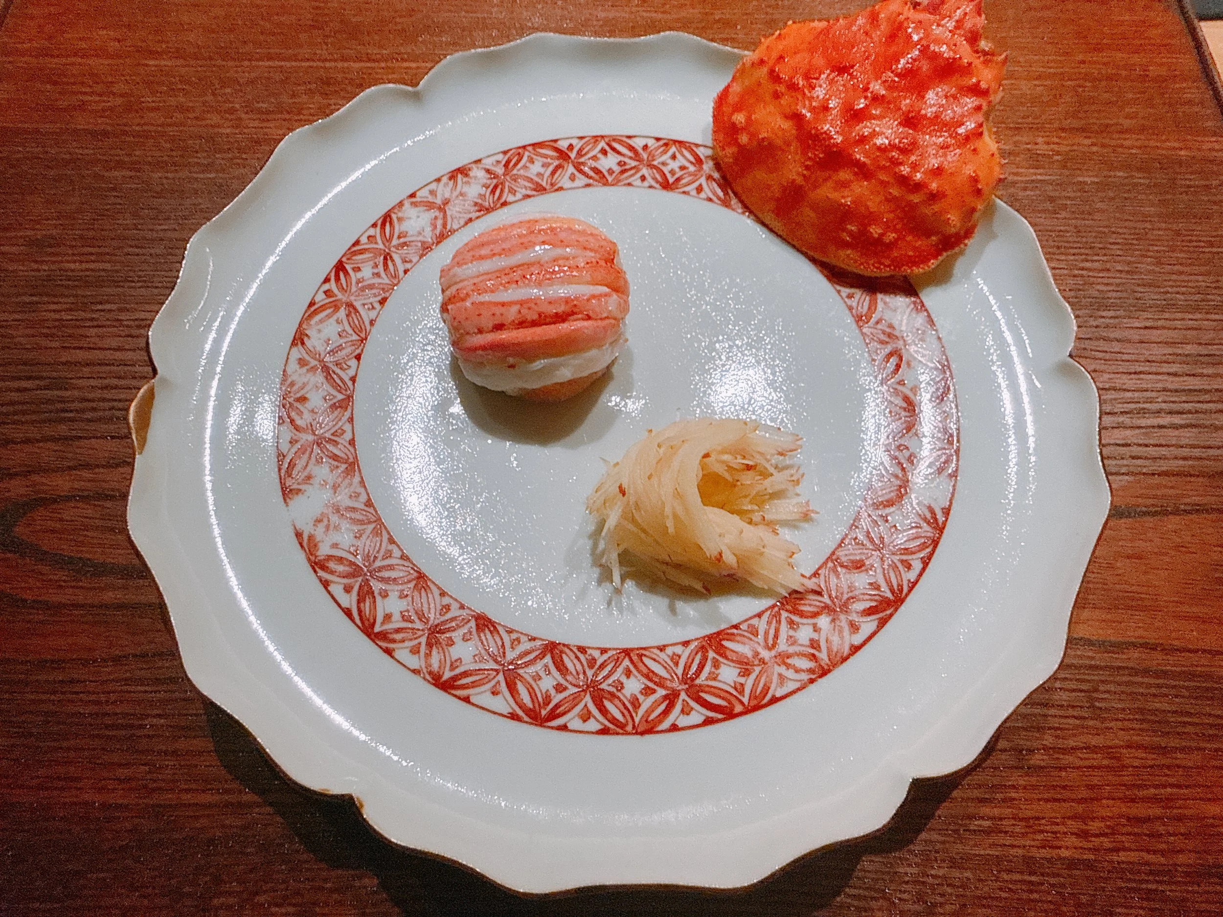Our next course was equally minimalist in terms of ingredients: a “crab dumpling” that had been made solely by (re-)combining different parts of a crab (its roe, its meat, its innards). The dish was “salted” by boiling the crab in the aforementioned seawater. Next to the dumpling were some thinly sliced apples and young ginger seasoned with sudachi juice. We were instructed to try the crab by itself first and then to add the apples on subsequent bites. The dumpling was served cold, and with its creamy roe, fresh meat and very crabby taste really distilled down the essence of a crab dish. The apples lightened the whole up a bit, and managed to do so without losing any of the crab flavor - very nice 17.