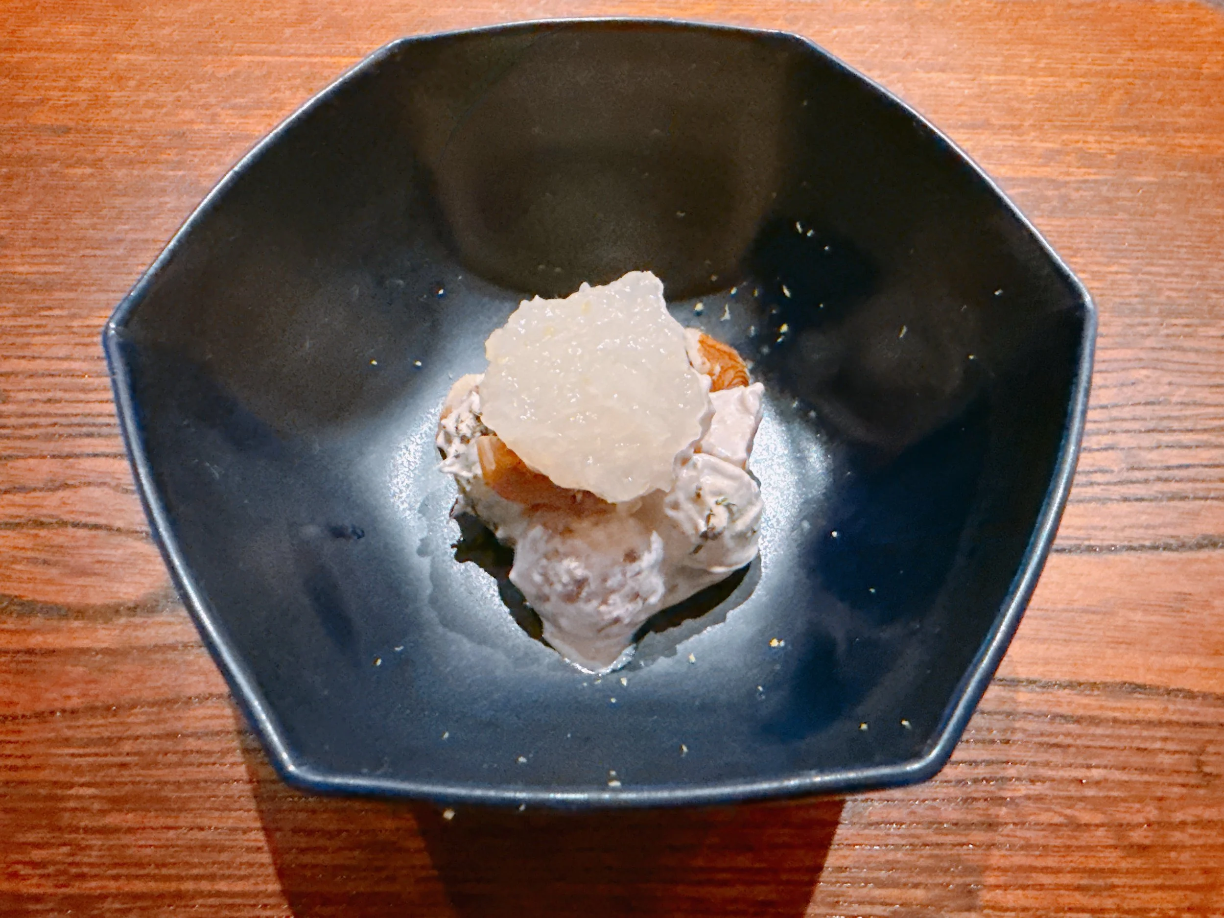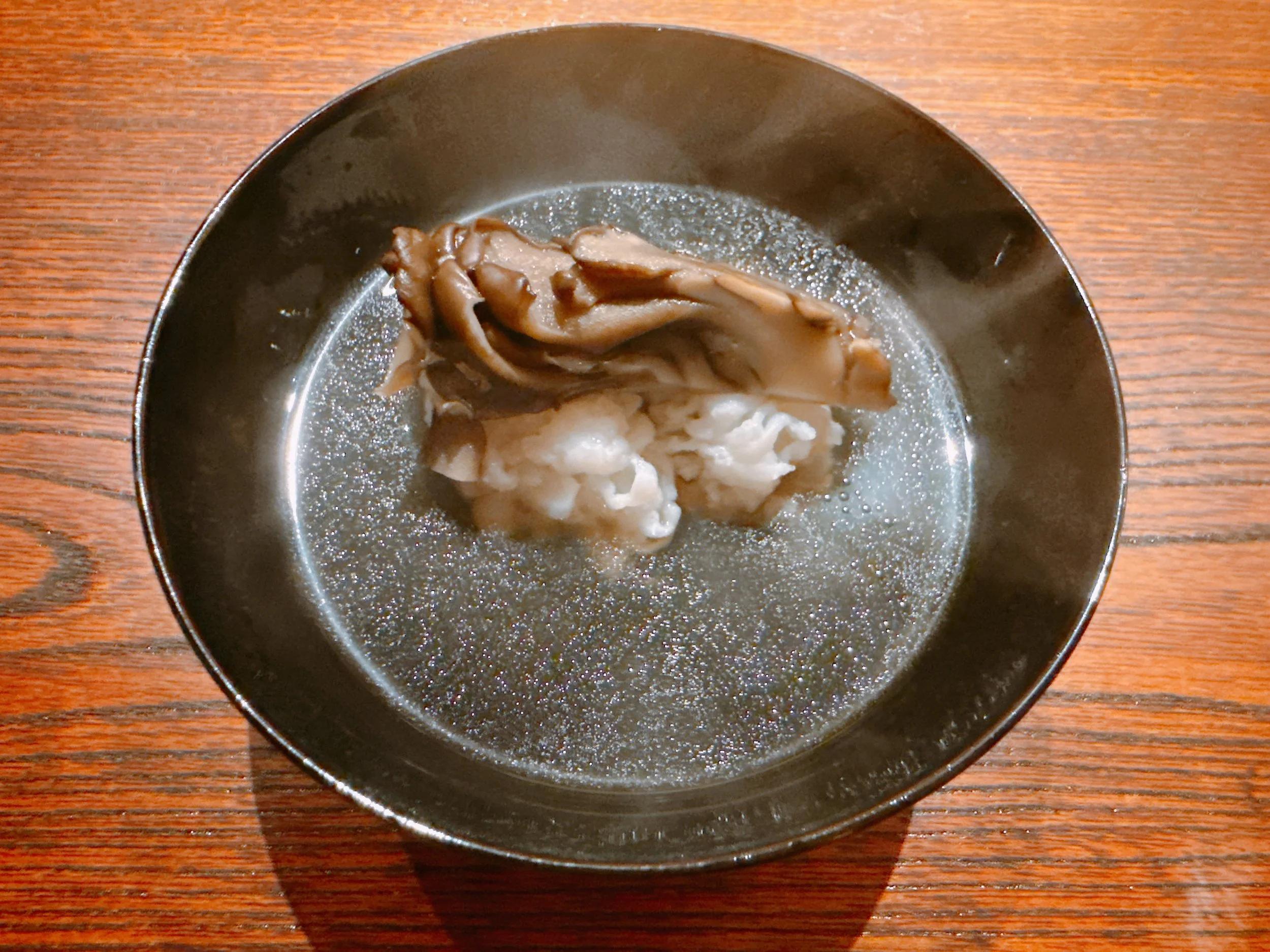 But on to the food. Our first course was a clear broth that initially contained a single simmered small mushroom. In front of us, freshly sliced matsutake mushrooms were added to the bowl. The broth had a subtle, but quite enjoyable mushroom flavor, and the matsutakes added some texture and a light mushroom flavor. The ingredients here were literally just mushrooms, water and salt - no other seasonings whatsoever. It doesn't get much simpler than that, and it was nice to see that the mushrooms were really allowed to be the sole star of the show. But actually, there was more: the kitchen (technically) hadn't even added salt to this dish. Instead, the restaurant had sourced seabed-spring water, essentially seawater that originated from underwater fresh water springs. That water was salty, but not as salty or as mineral-heavy as “regular” seawater would have been. By blending this seabed water with mountain spring water, the kitchen was able to achieve the desired salt content for the broth.