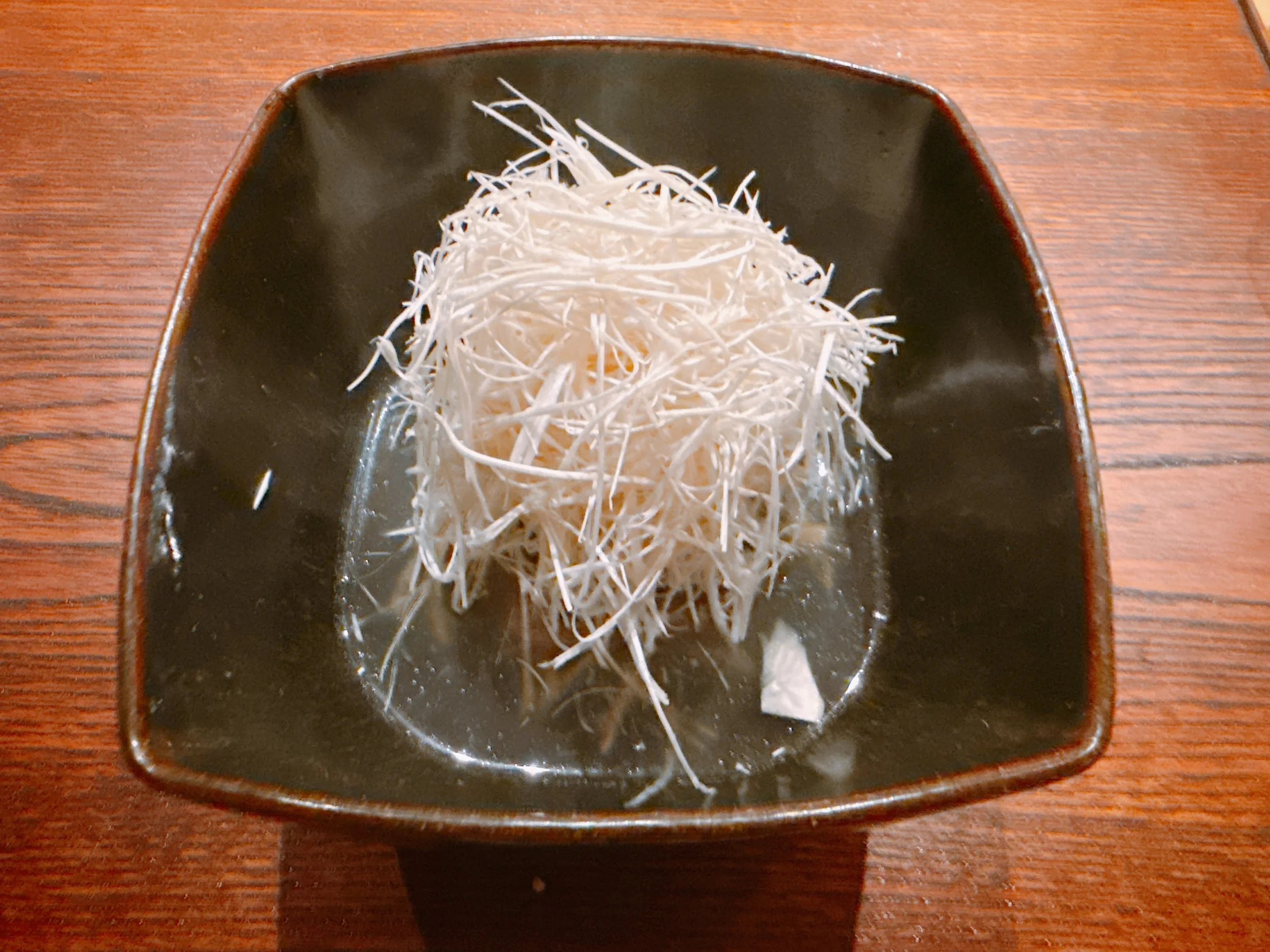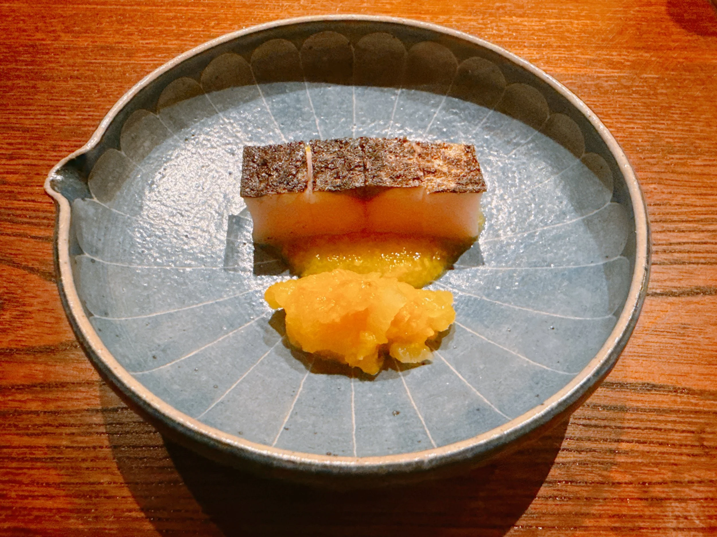The following grilled fish course featured sawara (Spanish mackerel) that had been smoked and then grilled on its skin. The fish came with a vinegary sauce, as well as some daikon mixed with chrysanthemum. Compared to what came before, this dish had quite a long list of ingredients (sawara, daikon, green onions, sake, salt, lemon juice, white soy, etc), and it showed: the flavors were much, much stronger than in previous courses. The fish had a nice texture: fatty, rich, almost raw and sporting a crunchy skin. The flavors had an equally wide range, going from smoky to fruity to slightly acidic. A great combination of a lovely fish and an amazing sauce 18.