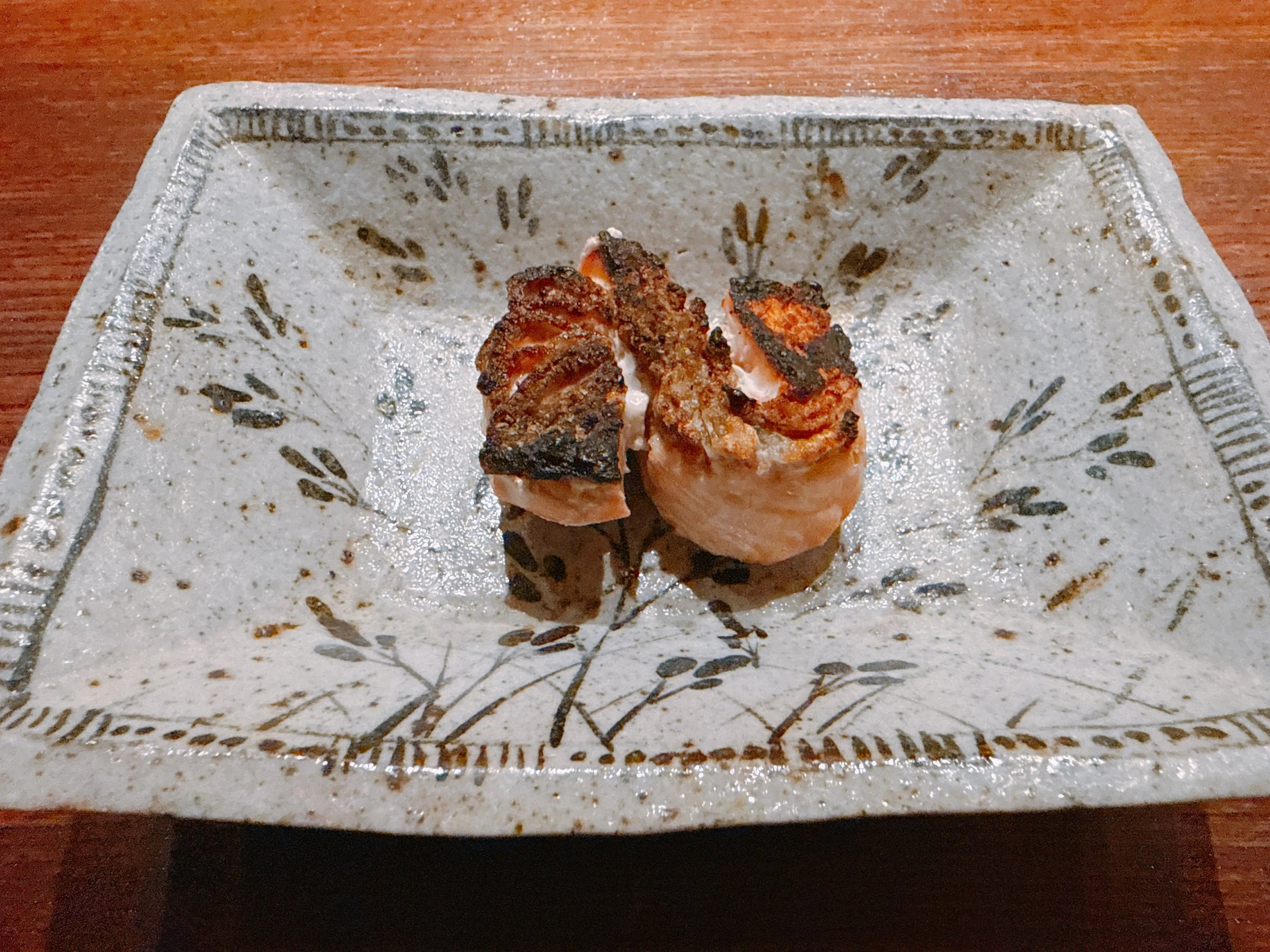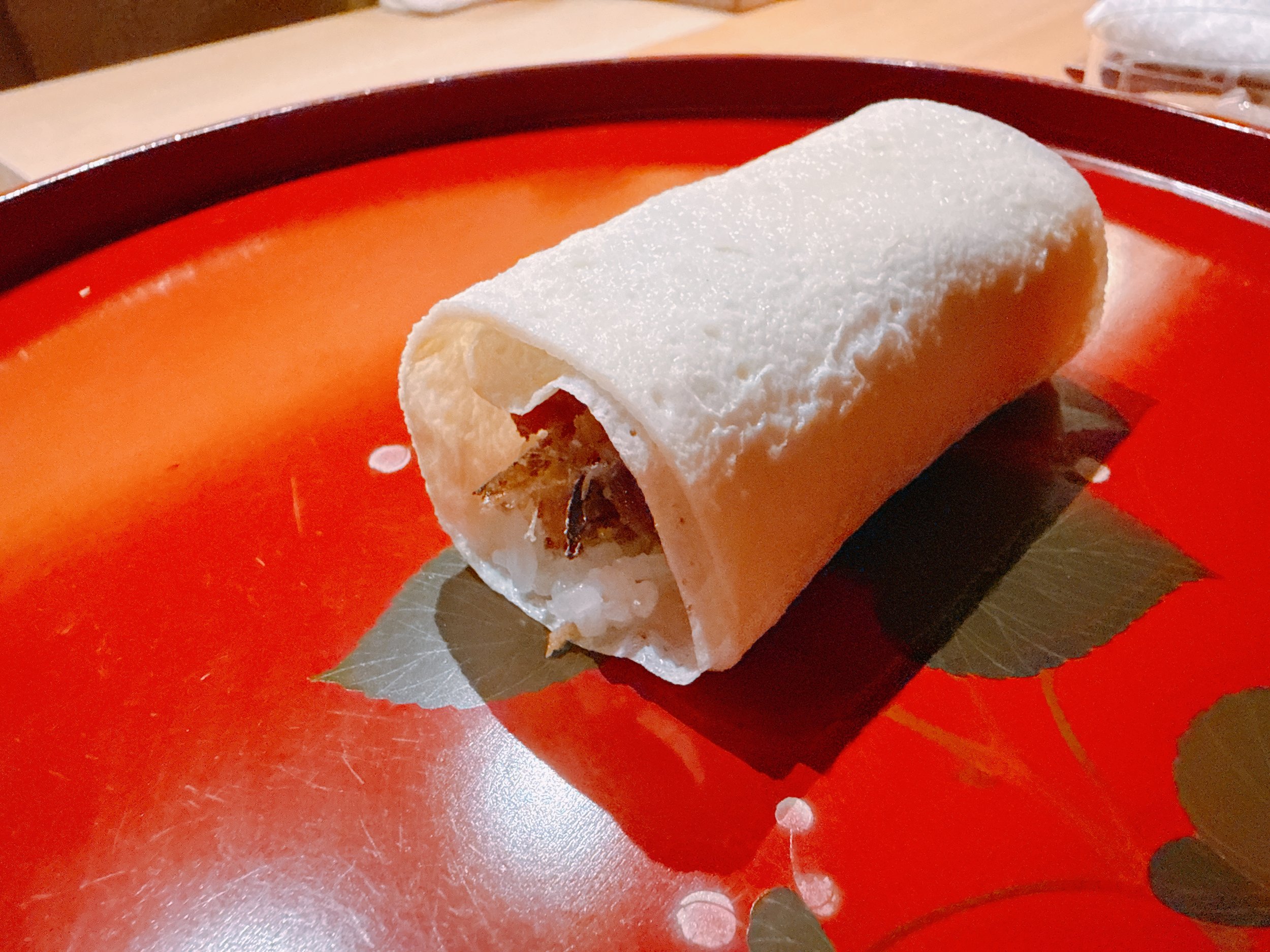 One of the restaurant's signature dishes was a hand roll. I should say “hand roll” in quotes, since it was quite different from what one might see in a sushi restaurant. First of all, instead using nori seaweed, this hand roll was wrapped inside a thin egg omelet. How one goes about making such a thin omelet that does not tear - even when being eaten -, is a mystery to me. But the omelet gave the dish a much softer texture than nori would have done. Equally unusually, the hand roll was given to us unrolled. Initially, the omelet was topped only with sushi rice and the fried bones of the fish: smelt (shishamo) from Hokkaido. To this, the grilled smelt meat was added by the chef directly from the grill. Minimalism struck again with essentially only three ingredients: smelt, eggs, and rice. The combination was simple, but very, very good. The bones gave the hand roll's filling a nice crunch, reminding me of a fried, battered fish filet - but without any use of batter. Very impressive. The fish had a slightly mealy consistency vaguely similar to eel. Just based on taste alone, one might rate this a 17, but the preparation was quite ingenuous 18.