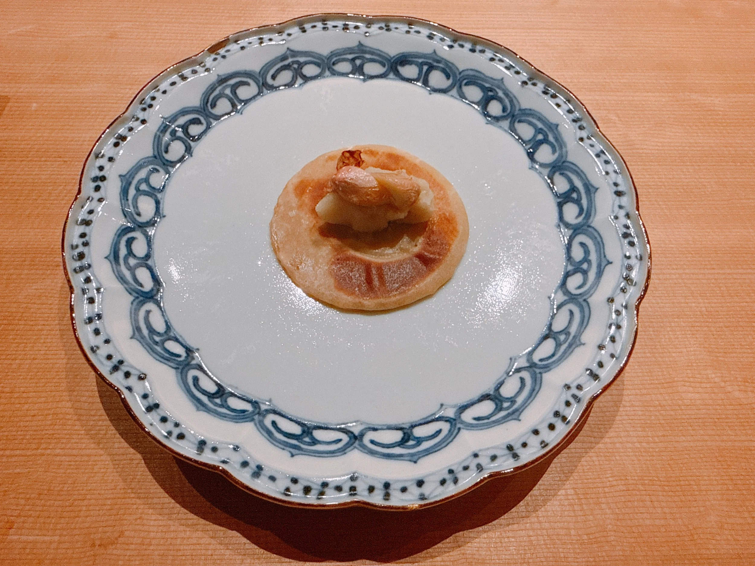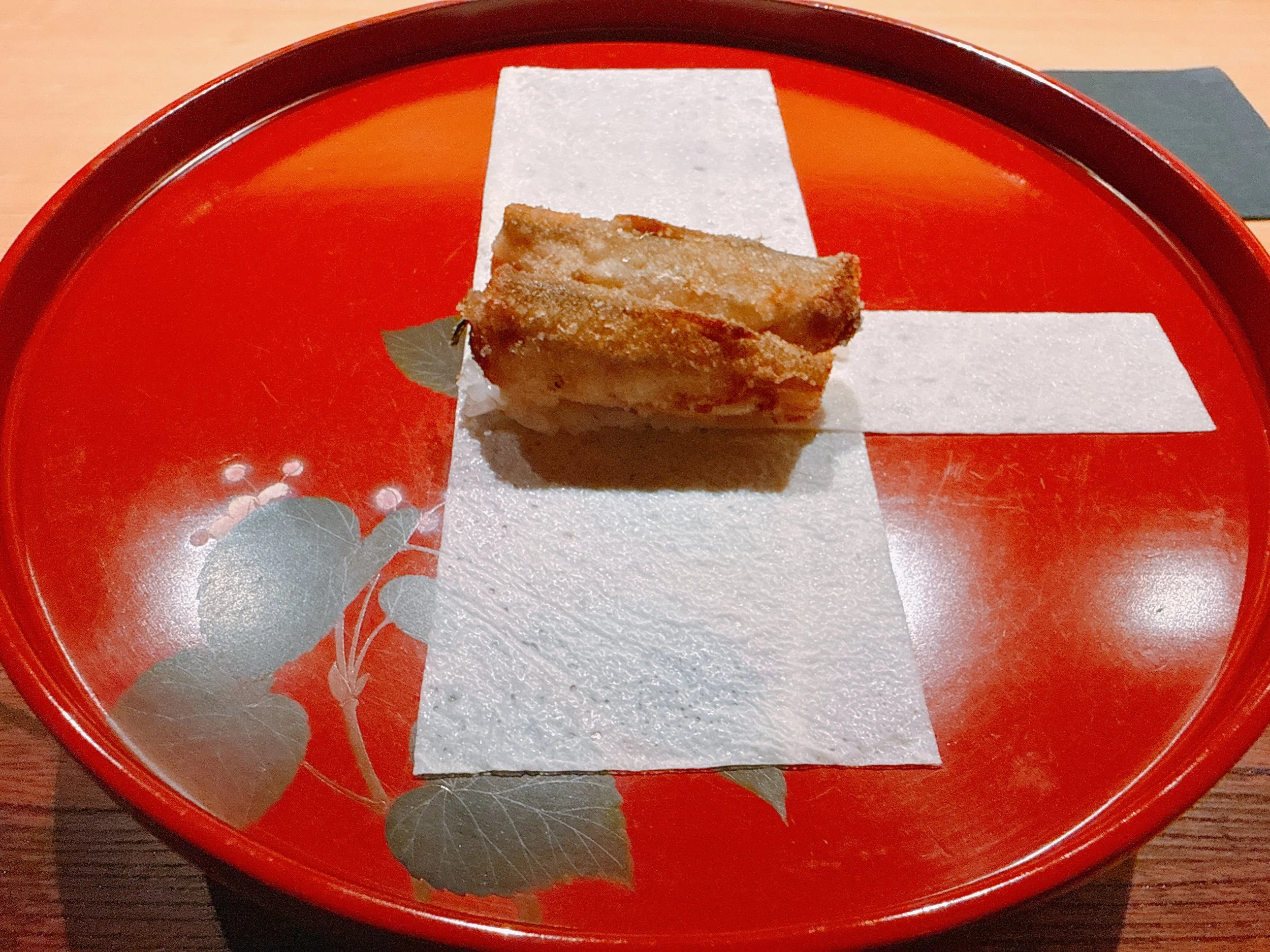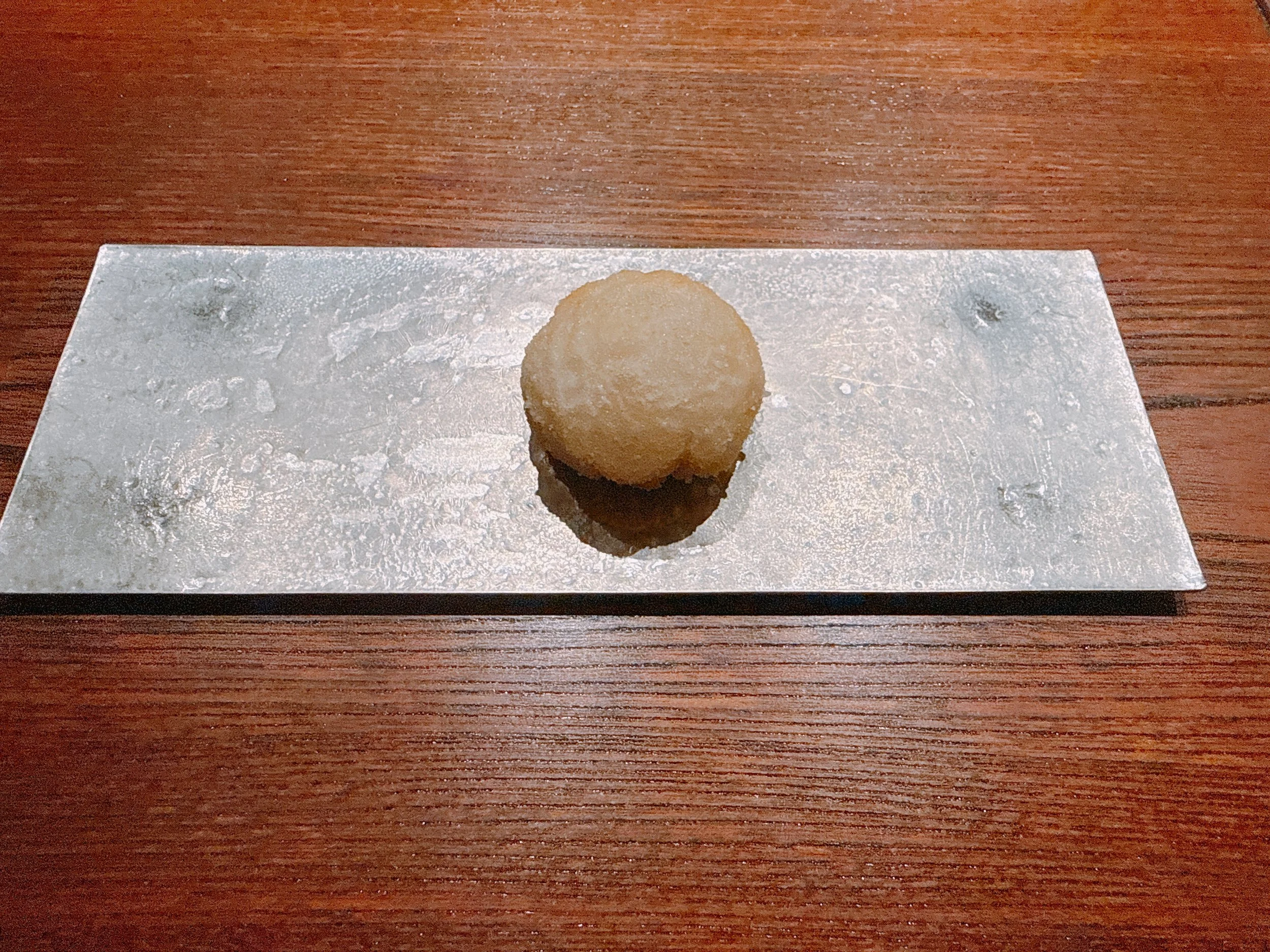 The next course was made with suppon aka soft-shell turtle. However, had we not been told, I doubt that anybody would have guessed at the turtle's involvement, since there was no actual meat in the dish. Instead, we got a fried sesame tofu that was enclosed in a sweet mochi rice shell. Both tofu and mochi had been soaked in suppon broth, but I couldn't make out any turtle flavor. The tofu was very creamy, and the mochi fatty and oily. This dish seemed to be all about texture, with barely any flavor. The paired hot sake added to the impression that we were enjoying an elevated bar snack 14.