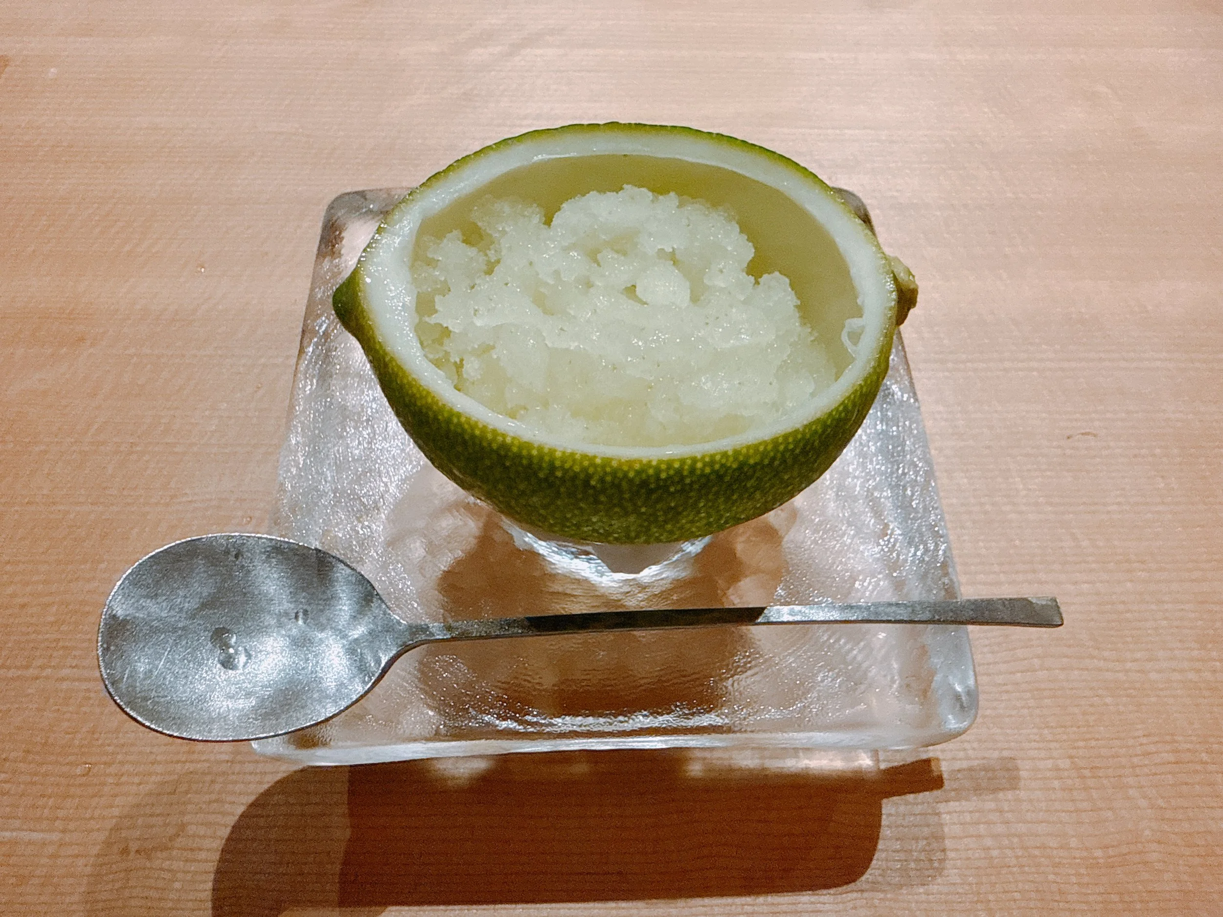 Palate cleanser number two. Green (as in “unripe”) lemon sherbet was served in a hollowed out green lemon. In a cute twist, the “lid” of that lemon still had its meat attached, and we were instructed to squeeze its juice onto the sherbet underneath. The result had lots of flavor, with a perfect balance of sweetness and acidity. Yum 18.