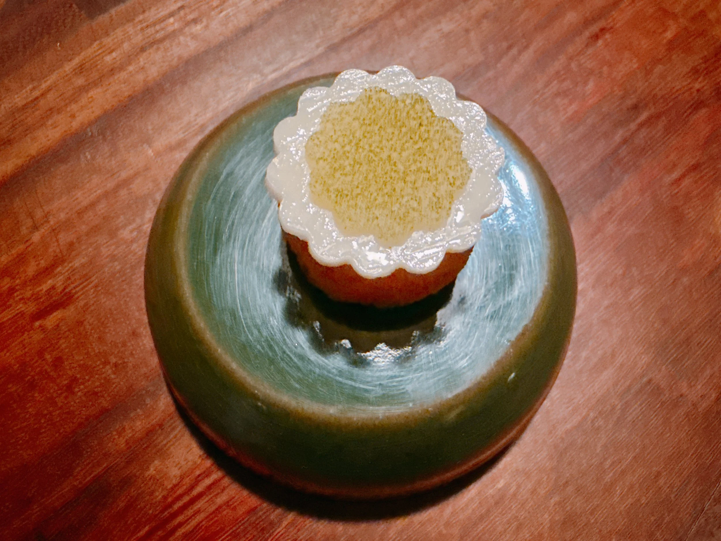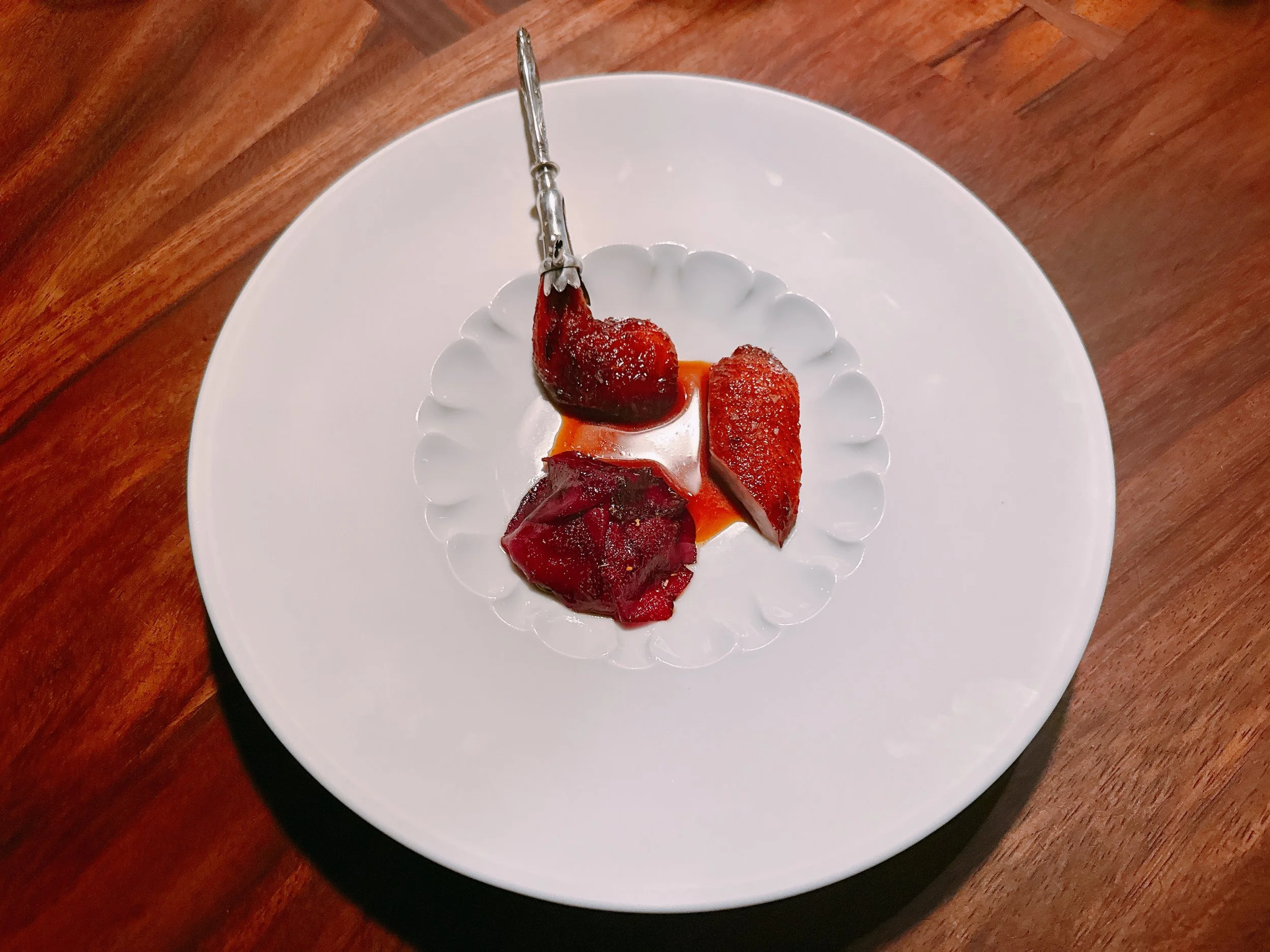 A little tartlet contained a venison tartare, an egg yolk and fried lichen. This was a very autumnal dish, without any bright flavors (for better or worse). There was some smokiness to this bite, some umami and it had a creamy texture (presumably from the egg yolk) 16.