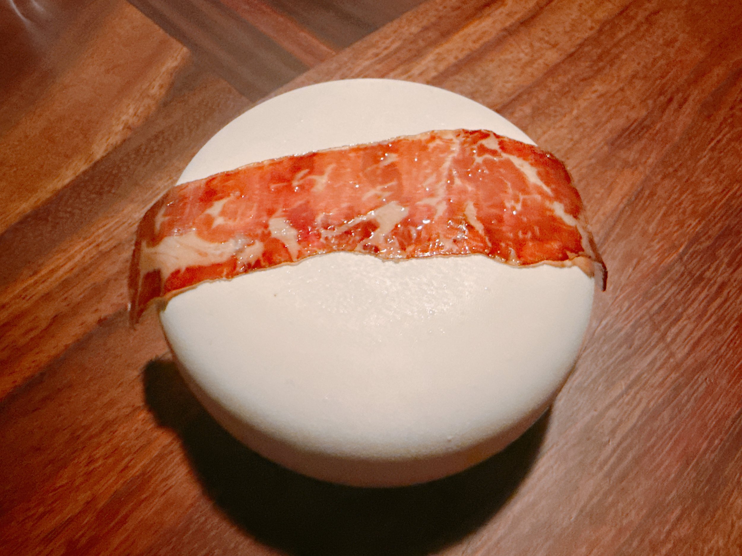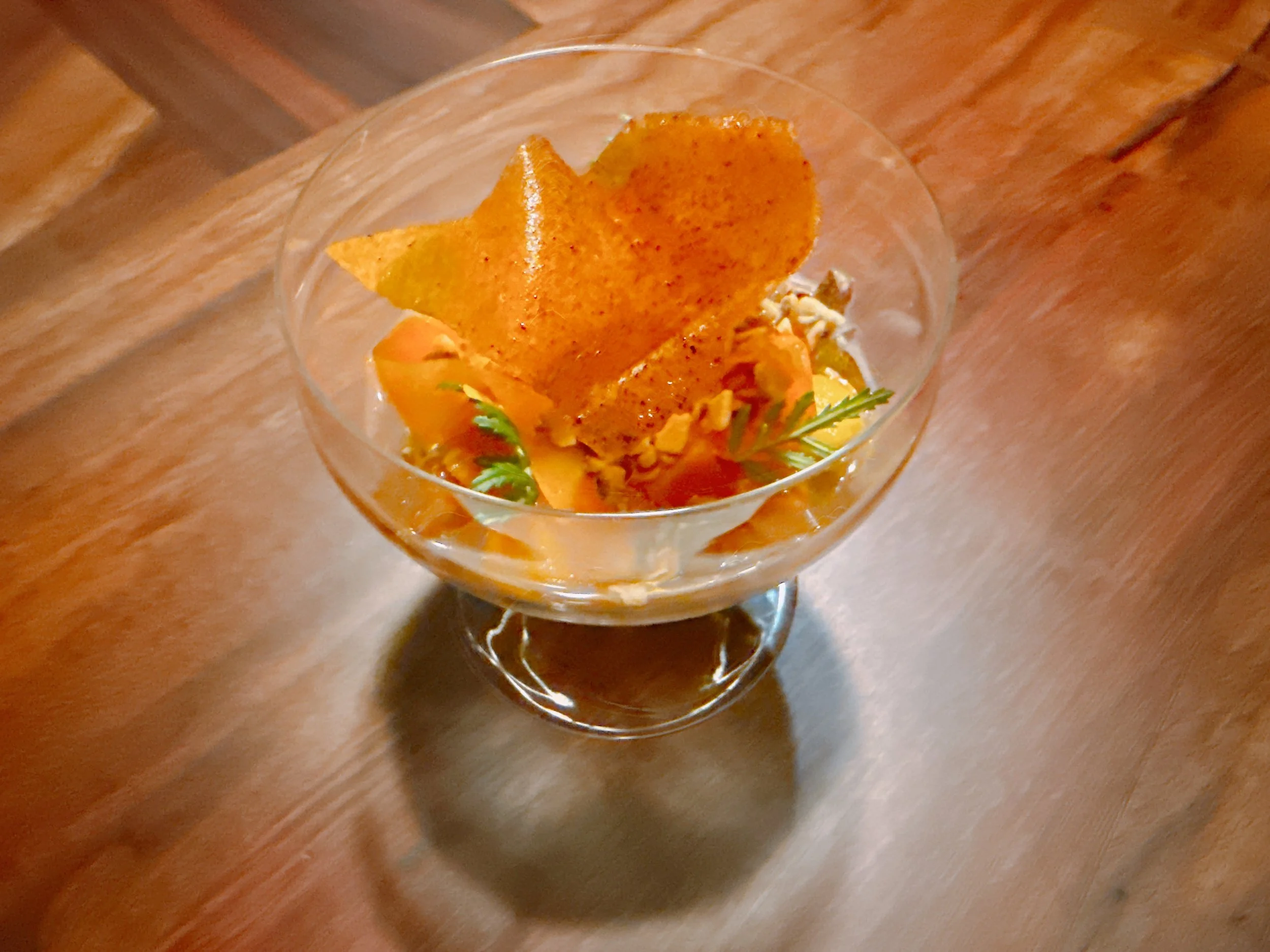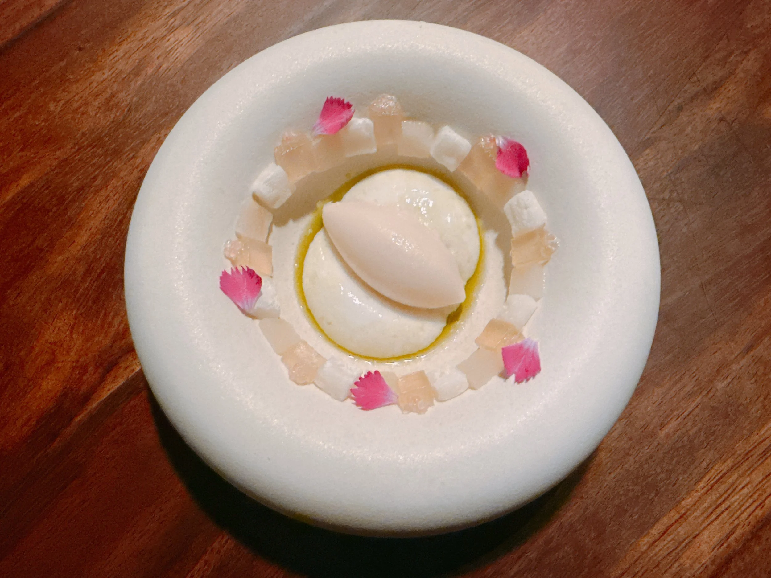 Next, we received a “lobster roll”, albeit a highly unusual one. A croustade ring was filled with spiny lobster meat and topped with a green goddess dressing, a lobster head emulsion, cilantro flowers and Fresno chilies. The ring sat on a glass plate that made it look like it were floating in space. This dish had a delicate texture, and the most notable taste came from the lobster filling. The toppings were much lighter in flavor and added a slight herbal note, but nothing that might overwhelm the lobster taste. This was my favorite among the appetizers 17.