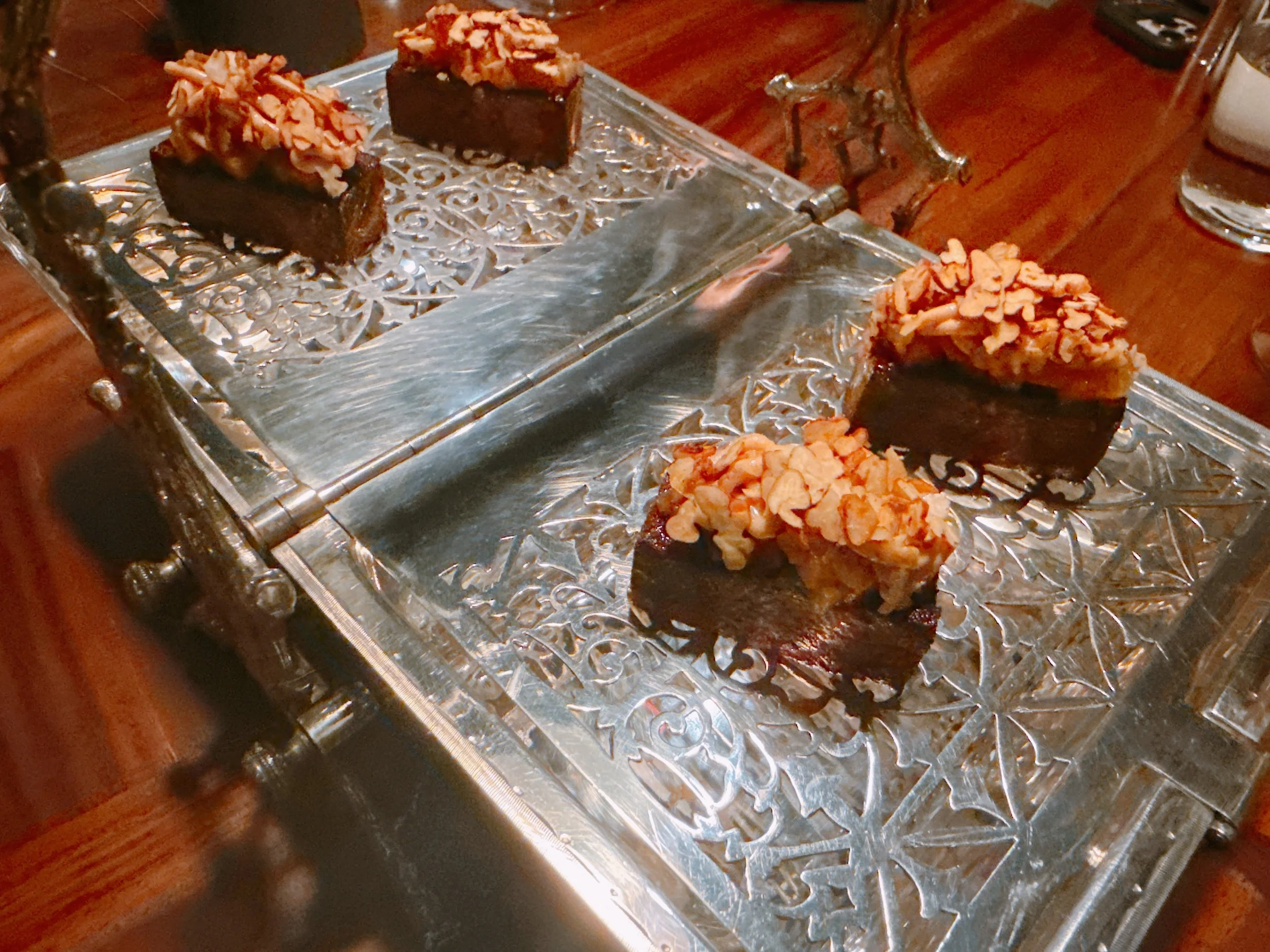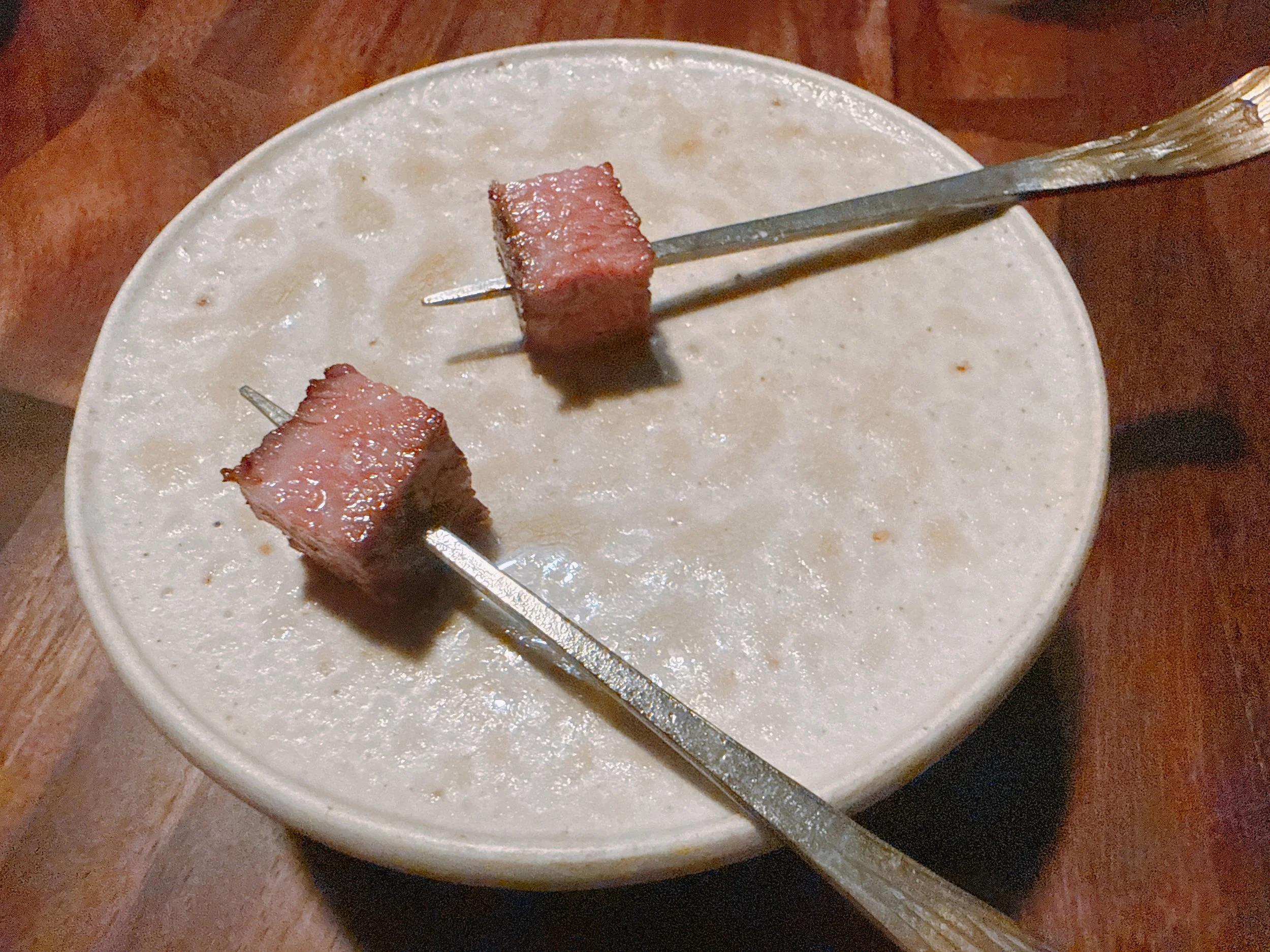The final appetizer was a rutabaga “bread pudding”, containing duck liver, pecans, some vadouvan spice and a bit of 100 year-old balsamic vinegar from Modena. This bite was creamy from the liver, but surprisingly not that heavy. The pecans added a bit of crunch 16.
