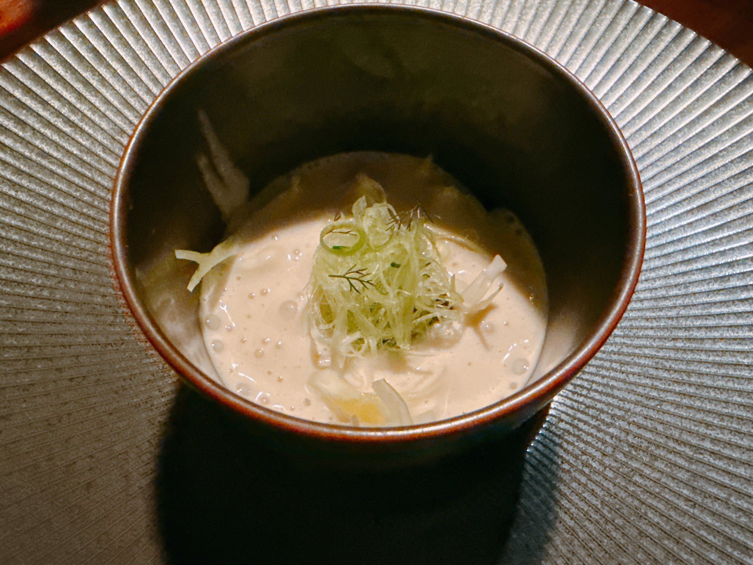 Another nod to the chef's New England heritage was the following clam-chowder-inspired chawanmushi. Besides the Japanese egg custard, the serving bowl contained celery root, caviar and a fermented white asparagus velouté. This dish had lots of clam flavor and a variety of different textures, ranging from crunchy to creamy 17.