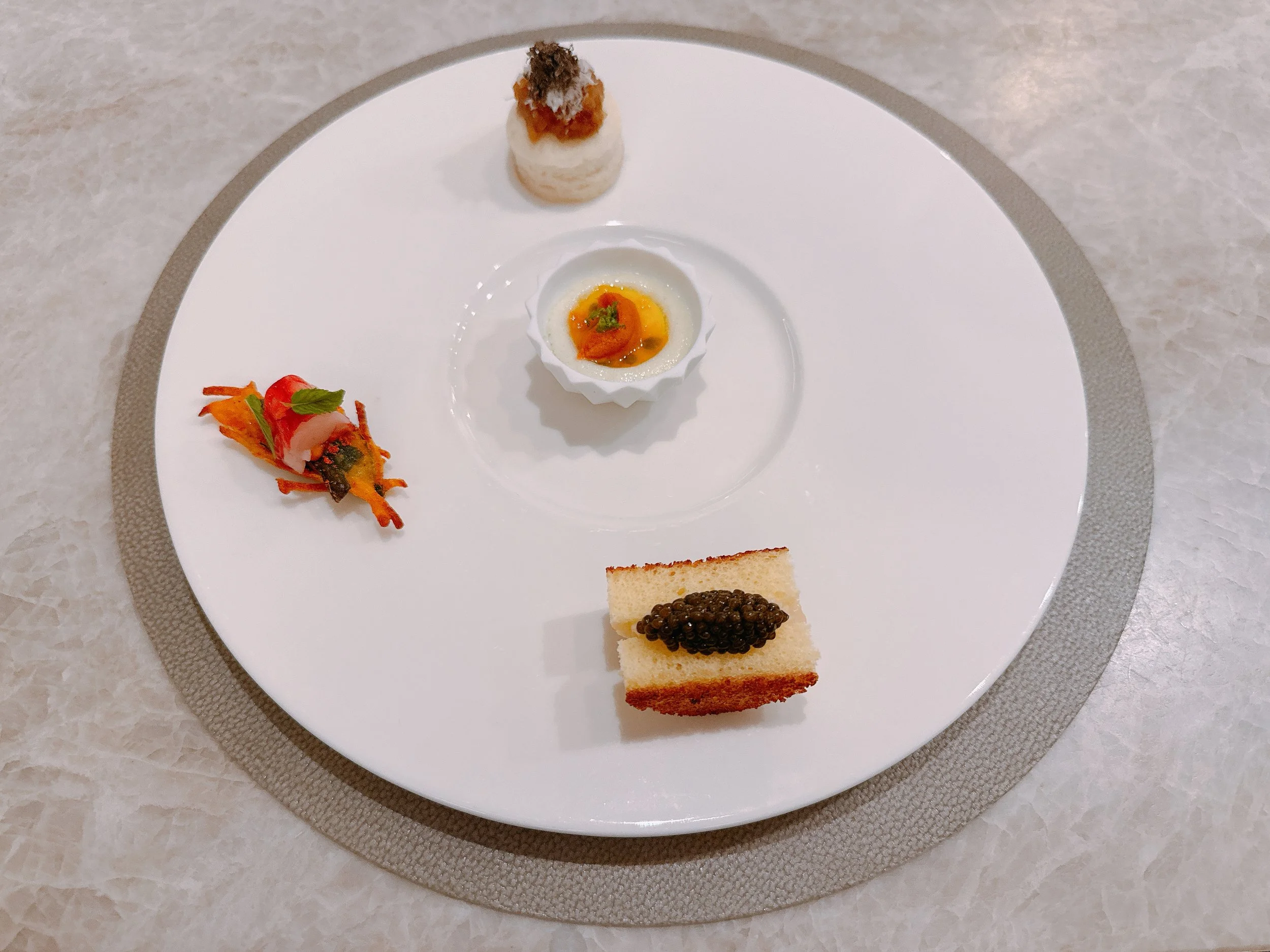 The first course that we received was a collection of four individual dishes, each supposedly prepared by a different chef. We started with a little toasted brioche sandwich that was filled with scallops, seasoned with garlic and chives, and topped with Ossetra caviar. A nice enough bite with a creamy scallop, but the caviar (as so often) disappeared a bit in this dish 15. Next, we tried a sweet potato fritter topped with a piece of prawn. Crunchy, light and vegetably. I wonder if this would have been better served warm rather than at room temperature 14. Our third bite was a steamed bun topped with caramelized onions and black truffles. The main taste came from the sweet onions, but overall, this was a bit too doughy for me 14. Finally, there was a sweet corn panna cotta, topped with uni (sea urchin) and seasoned with kaffir lime zest and passion fruit. The dish was sweet and a bit acidic, overwhelming the lighter flavor of the uni 14.