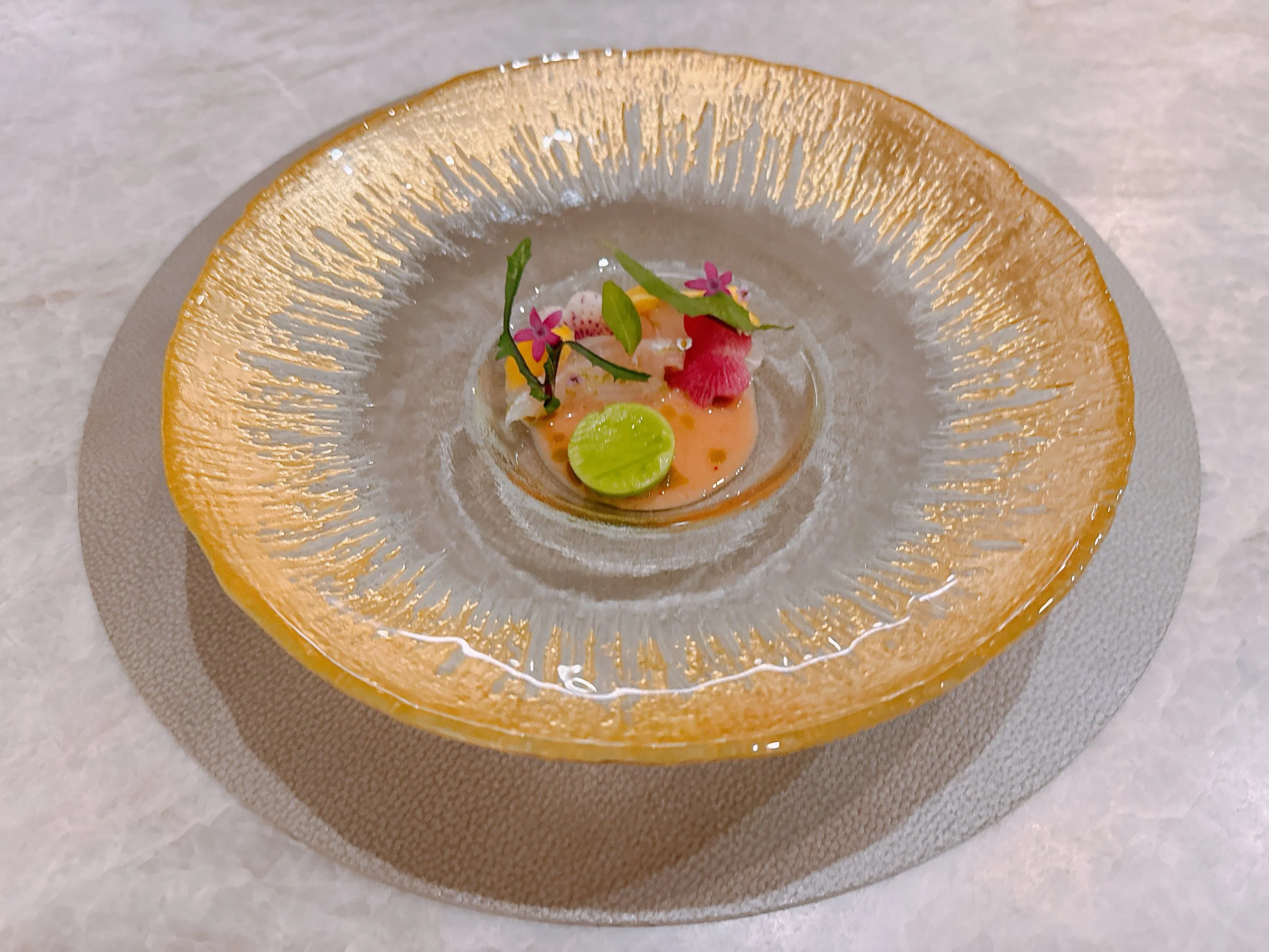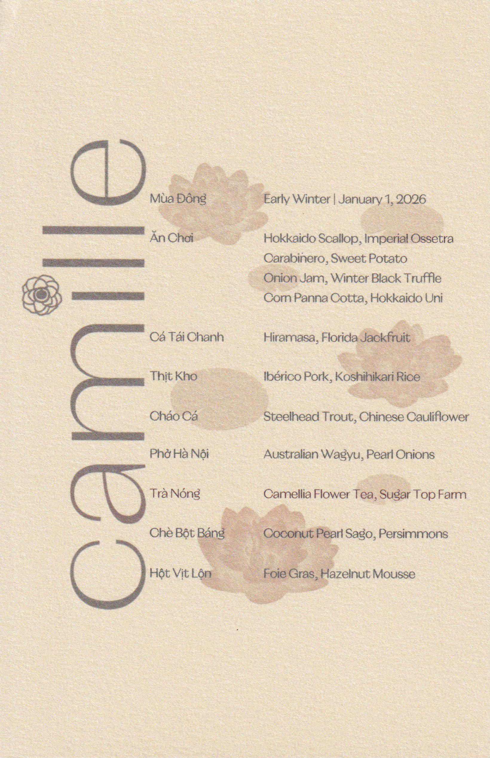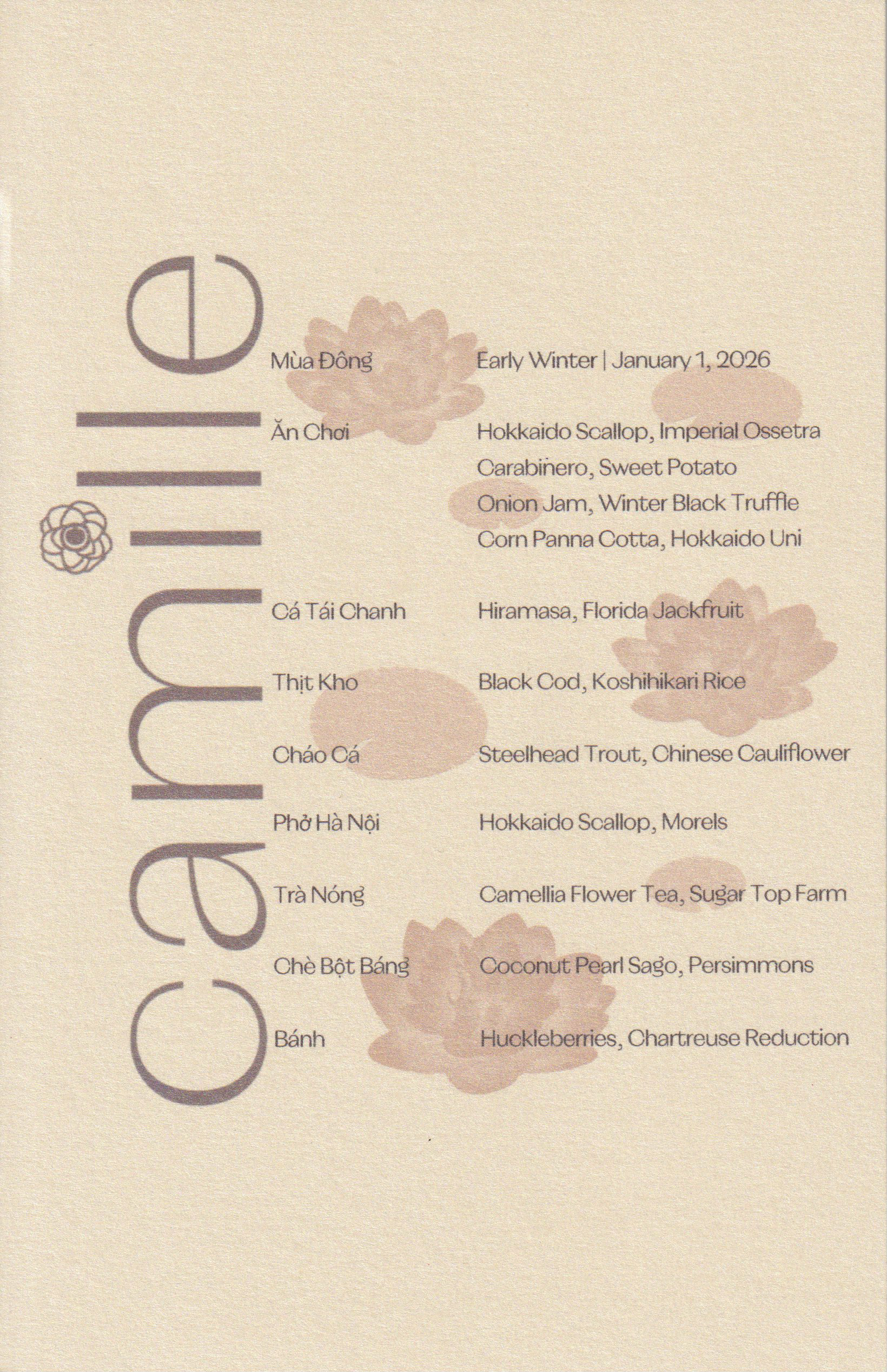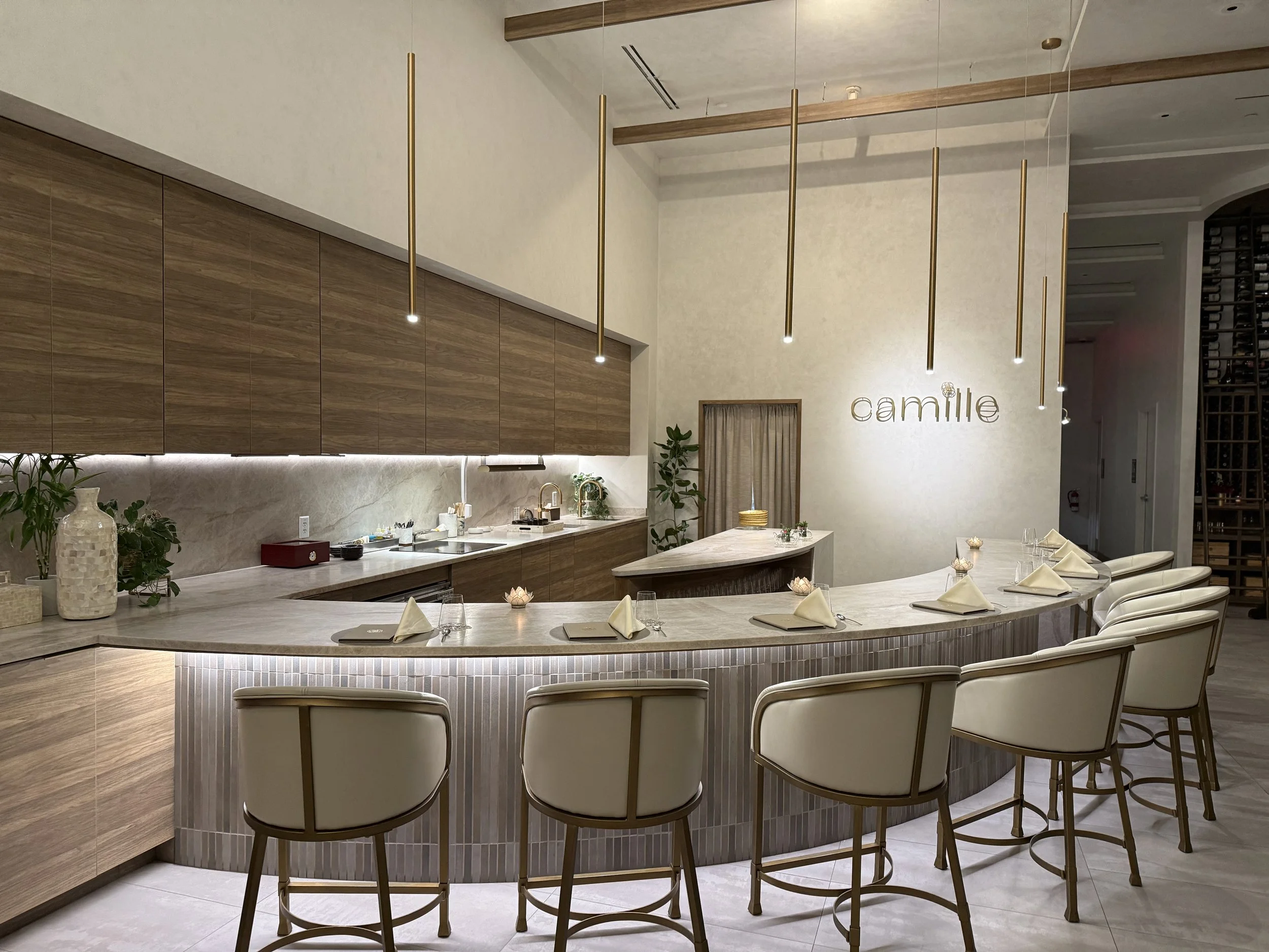 It was an unseasonably chilly January evening when we made our way to “Camille”. Right upon entering, we definitely felt a Michelin-star vibe. High ceilings, a modern interior design with everything in shades of beige, a chef's counter for eight diners prominently placed in the room, and four booths (and one glassed-in private dining room) along the opposite wall. Even before getting to our counter seats, we were welcomed with a complimentary glass of sparkling tea (with or without alcohol). A nice touch.