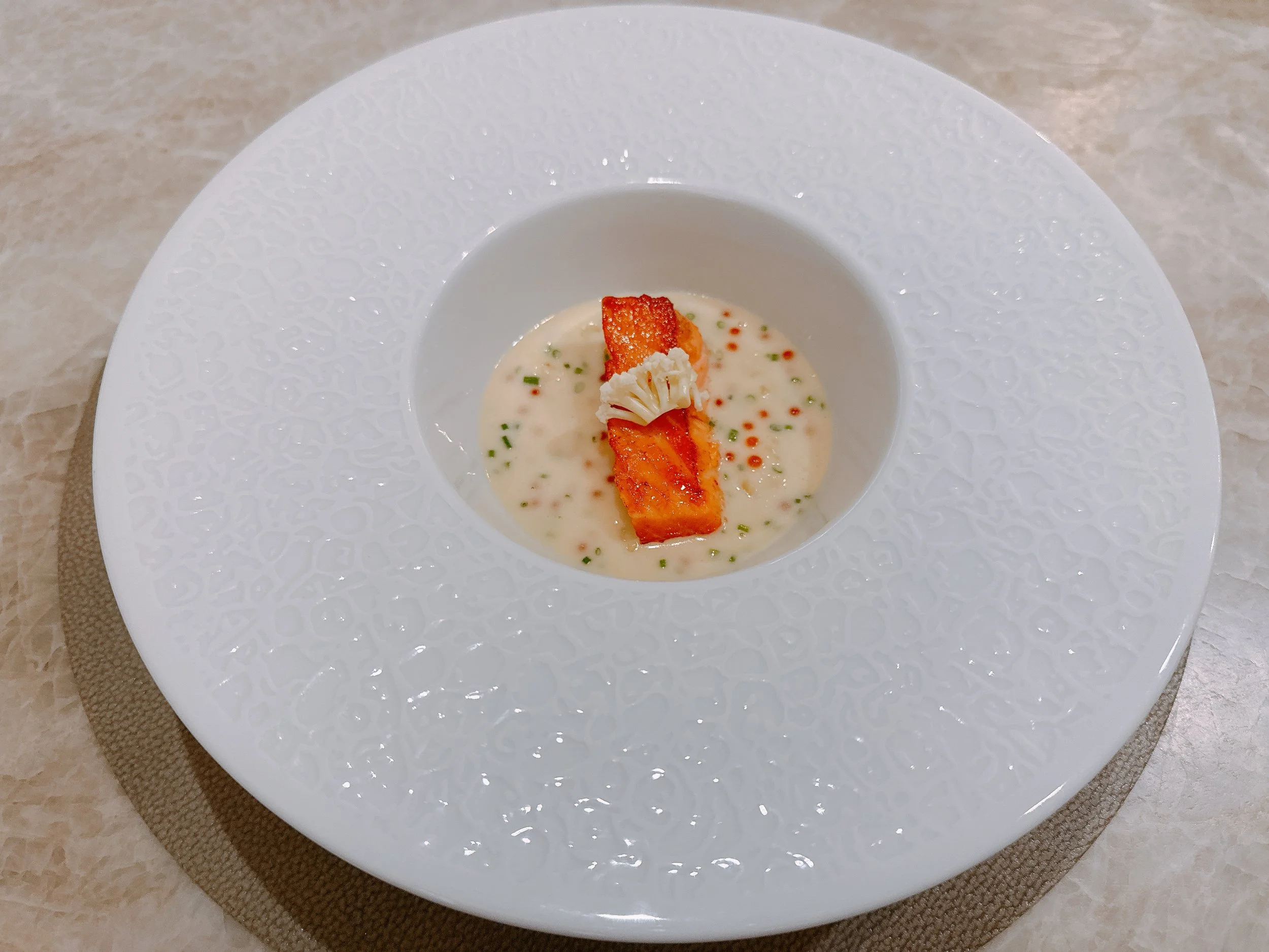 The following fish dish featured a filet of Scottish steelhead trout served over multiple preparations of Chinese cauliflower, which came pickled, as a puree, and as a congee. Chives and smoked trout roe gave the dish some dots of color. This course might have been the first one of the night that was served properly hot and not just warm or lukewarm. Overall, this was more of a cauliflower dish than a fish dish. The fish was flaky and fine, but flavorwise couldn't compete with the far more abundant sauce. Speaking of flavors, overall they were pretty light for this dish, the pickled cauliflower might have been the strongest contributor. Also, nothing about this dish felt particularly Asian other than the name-dropped “congee”. Well, maybe a true French rendition would have used a beurre blanc, but that also might have been an improvement in terms of flavor intensity 15.