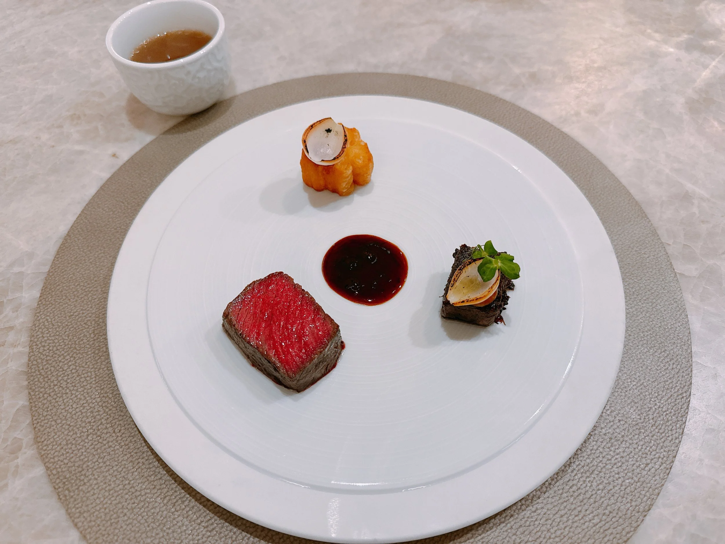 The final savory dish of the night was loosely inspired by northern Vietnamese pho. Two different cuts of Australian wagyu beef were served with a hoisin/beef jus sauce. Also on the plate: a breakfast donut dipped in pho, and a couple pieces of pearl onions. On the side was a small cup filled with pho broth. The two pieces of beef were very different. One was braised and very tender, the other had a significant bite - definitely not melting in the mouth. The accompanying sauce was pretty nice though, and very flavorful. The onions added a bit of freshness and acidity to the dish. The donut was a bit of a head-scratcher, though - oily and cold, it came with at most a hint of pho flavor. The hot broth tasted almost Christmassy - sadly I don't know enough about Vietnamese cuisine to judge whether that is typical for Northern pho 15. The pescatarian version had a scallop and a morel mushroom instead of the two beef cuts. According to my wife, the scallop was nicely seasoned, but felt previously frozen and was indeed still cold in the middle. The morel mushroom was juicy and flavorful 14.