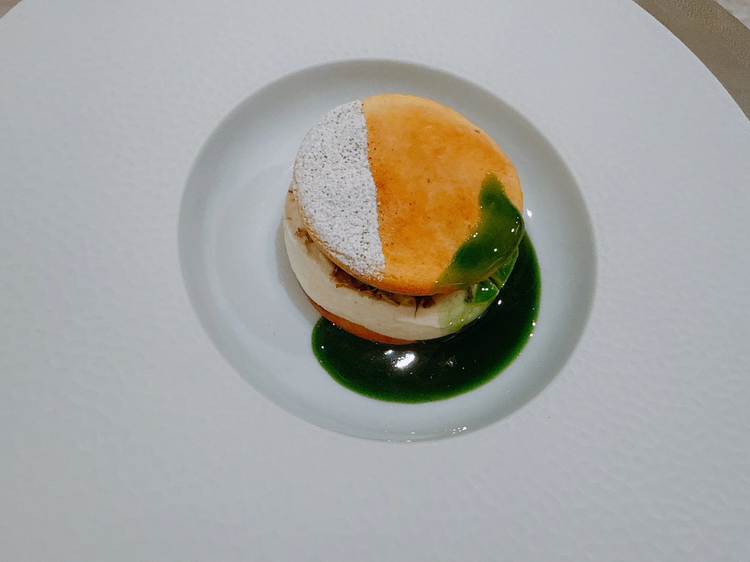 The second and final dessert was inspired by “balut”, but thankfully was not a literal rendition. Instead, we got a chocolate egg filled with foie gras (the “meat” part of the balut), a hazelnut mousse, and Vietnamese coriander. All of this sat on a “nest” of filo dough and blood orange jam. This was primarily a hazelnut/chocolate dish, but there were some fruit components as well (with possibly some pear inside?). I was getting beyond full at this point, but this was a lovely dessert 16. The vegetarian version of the dessert was a cookie sandwich filled with a white truffle pastry cream and huckleberry jam. Also quite sweet and maybe a bit lighter than the chocolate dish 15.