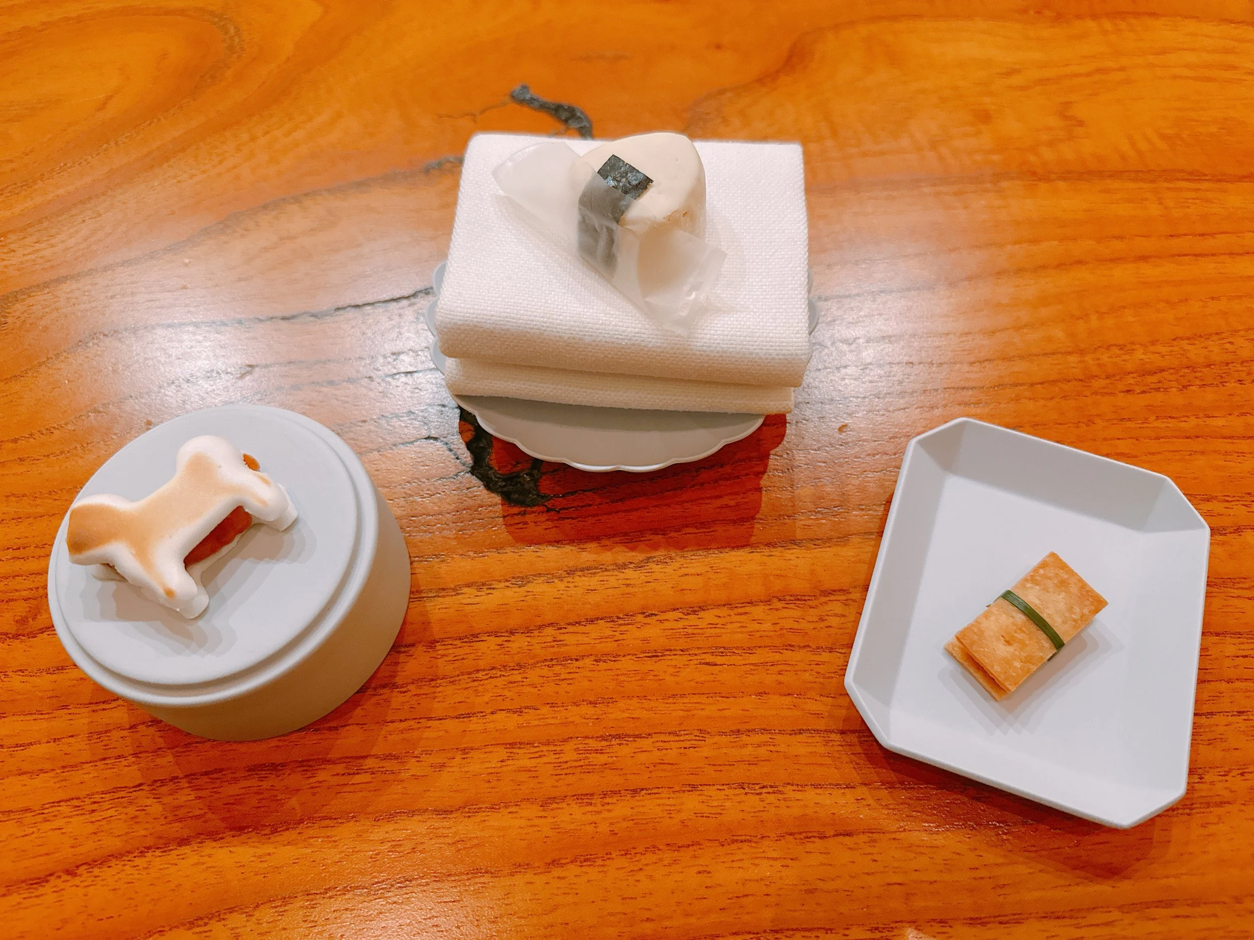 Our first course consisted of three individual bites, each meant to represent a typical Japanese ingredient (from the north, middle and south of the country, respectively). First, there was some uni (sea urchin) from Hokkaido, served sandwiched between two dashi meringues shaped like a dog. (The chef's dog is called “Uni”.) When eating this, the meringue with its light sweetness seemed like an odd choice at first, but the main taste impression quickly changed to a strong uni flavor. This was a dish that definitely put its star ingredient front and center 16. What looked like a little onigiri was actually a white chocolate praline filled with fermented sea cucumber and partially wrapped in nori and an edible potato paper. Here, the flavor balance wasn't quite as compelling: the white chocolate was predominant, and once it had melted away, there was “just” an aftertaste of nori. Not bad, but maybe not exactly what had been intended 15. Finally, we had another little sandwich, this time two toasted crackers filled with mullet roe and wrapped with chives. Similarly to the first bite, there was a progression from slightly sweet (the cracker) to savory (the roe). The roe had the chewy texture that one would expect from bottarga 16. Somewhat unusually, we got a presentation of the three main ingredients (uni, fermented sea cucumber, and mullet roe) after rather than before the course. I suppose that works equally well.