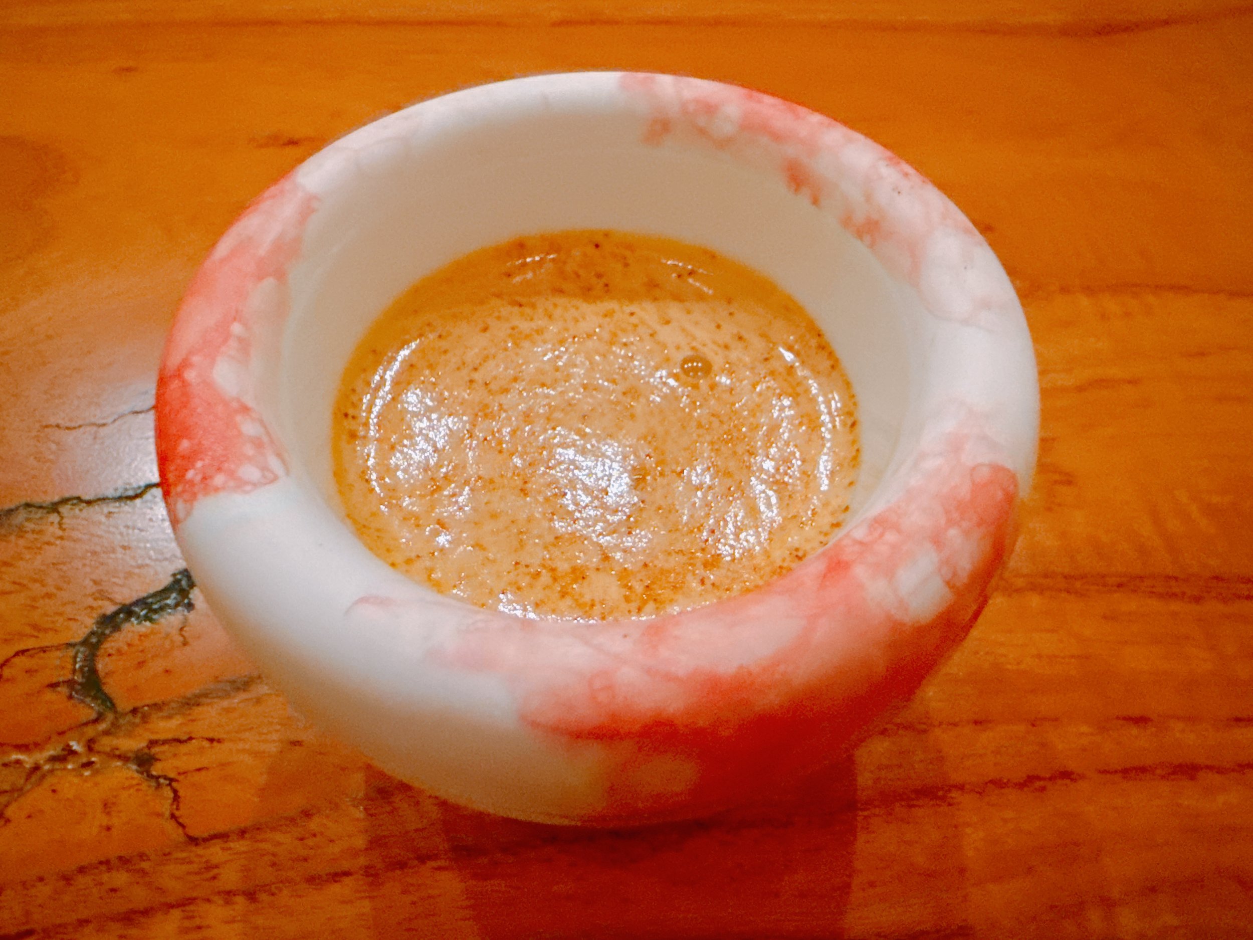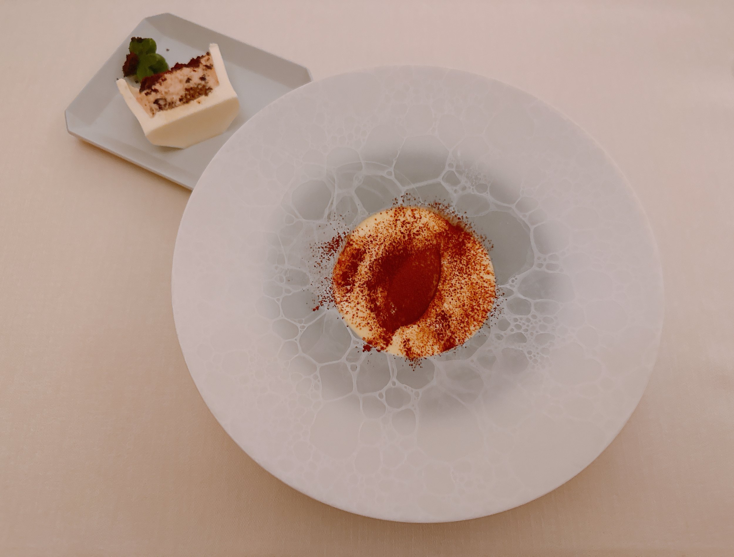Next came a ramen-inspired dish. Cuttlefish had been cut into the shape of noodles, and was combined with hairy crab meat and red bell peppers. All of this came in a dashi thickened with kudzu powder, an aerated tomato foam, and espelette pepper powder. Served very hot, this dish was very good: full of flavor, in particular of tomatoes, and lightly spicy. Overall, the flavor profile was more rustic compared to most previous dishes, but good 17.