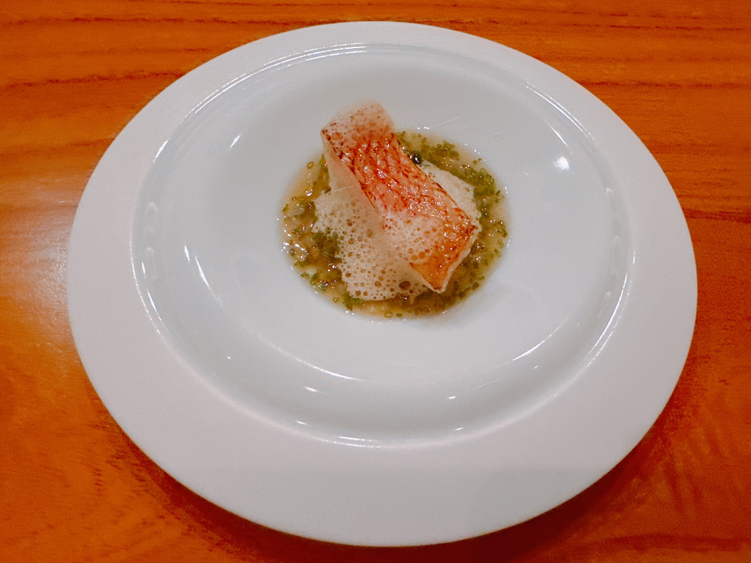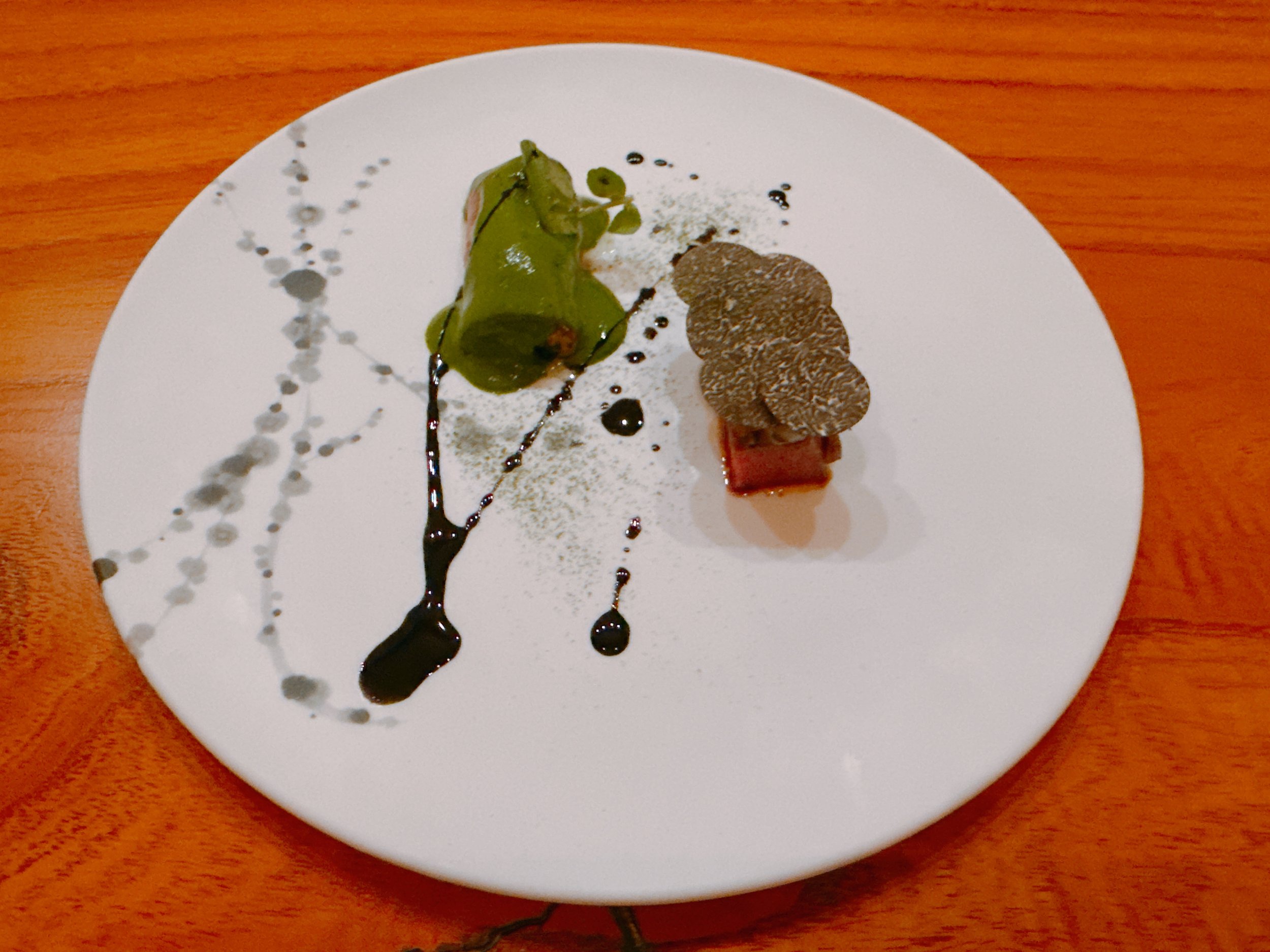 A filet of kinki fish was served with grilled avocado, an oyster, celeriac, a thickened dashi and hojicha milk foam. The fish was cooked nicely, but was served lukewarm at best. The oyster had a strong flavor, and the sauce reminded me of cooked pickles. A fine dish, but had it been served warmer or given more flavor, it would have been even better 16.