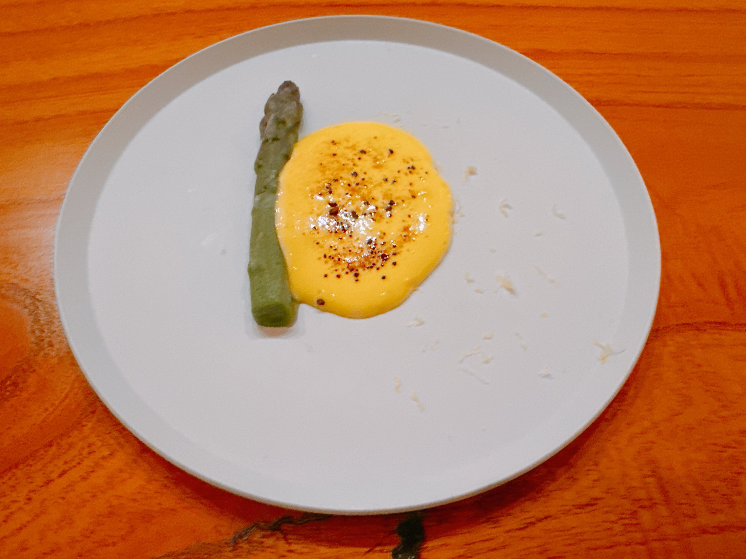 The next dish looked like a spear of green asparagus with a savory sabayon, but was actually a white and green asparagus sorbet paired with a sweet sabayon. The latter was topped with toasted hazelnuts, lemon zest and coffee powder. The sorbet tasted very much of asparagus, and actually worked quite well with the crunchy hazelnuts and the sweet sauce 17.