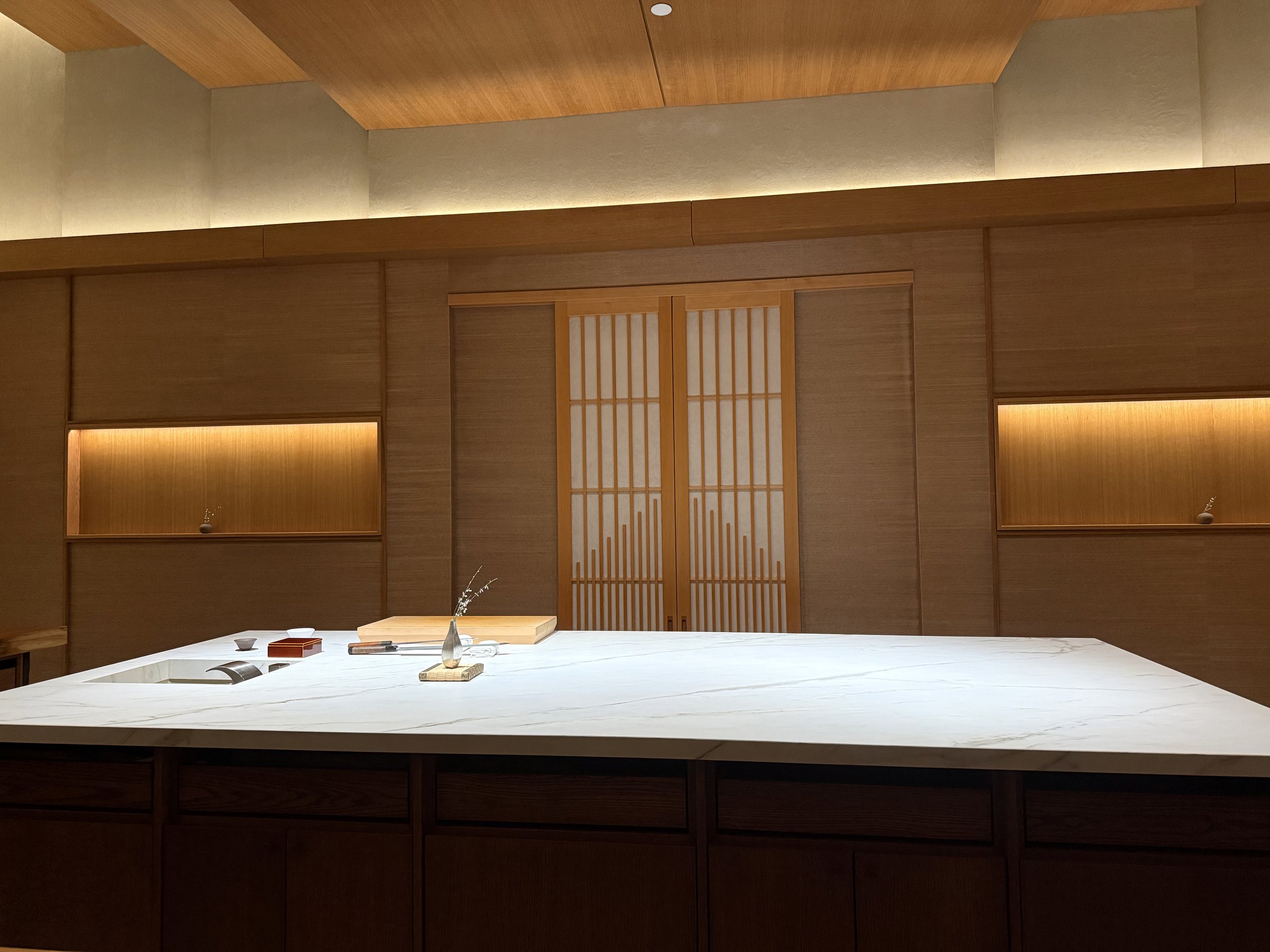 After this brief tour of the building (which I suppose might not happen if the private dining room was in use), we were led - one party at a time - to the main dining room. Here, ten diners ended up seated around an U-shaped wooden counter. At the center of this U-shape was a large wooden counter helmed by chef William Shen. During the following dinner, servers and/or chefs would deliver dishes to each party individually. So while everyone was always on the same course, we were not served at the exact same time. In fact, when all five parties were handed their dishes simultaneously, the five overlapping conversations became a bit cacophonous. Seating-wise, there were substantial gaps between neighboring parties, making it feel more like separate tables rather than a true counter experience.