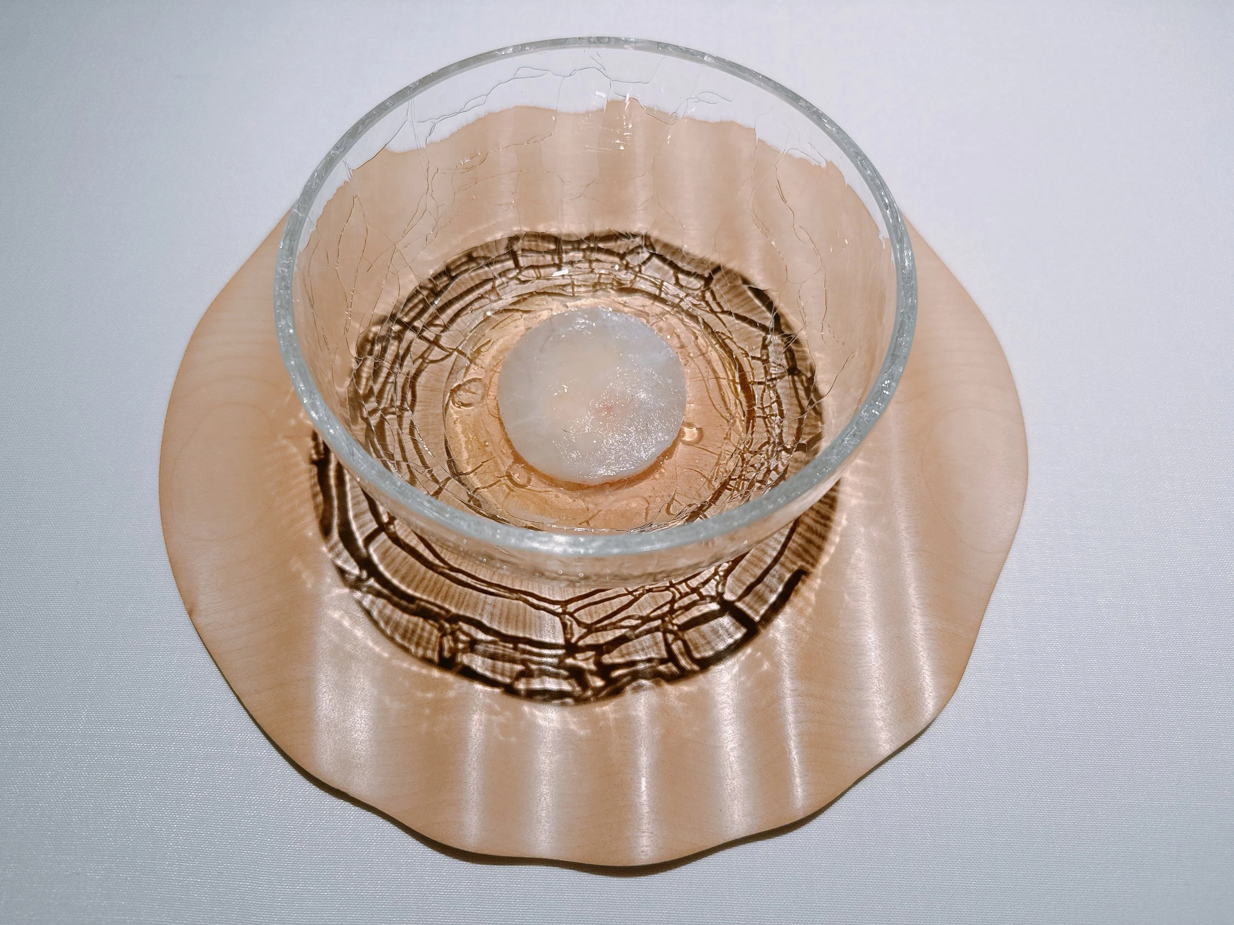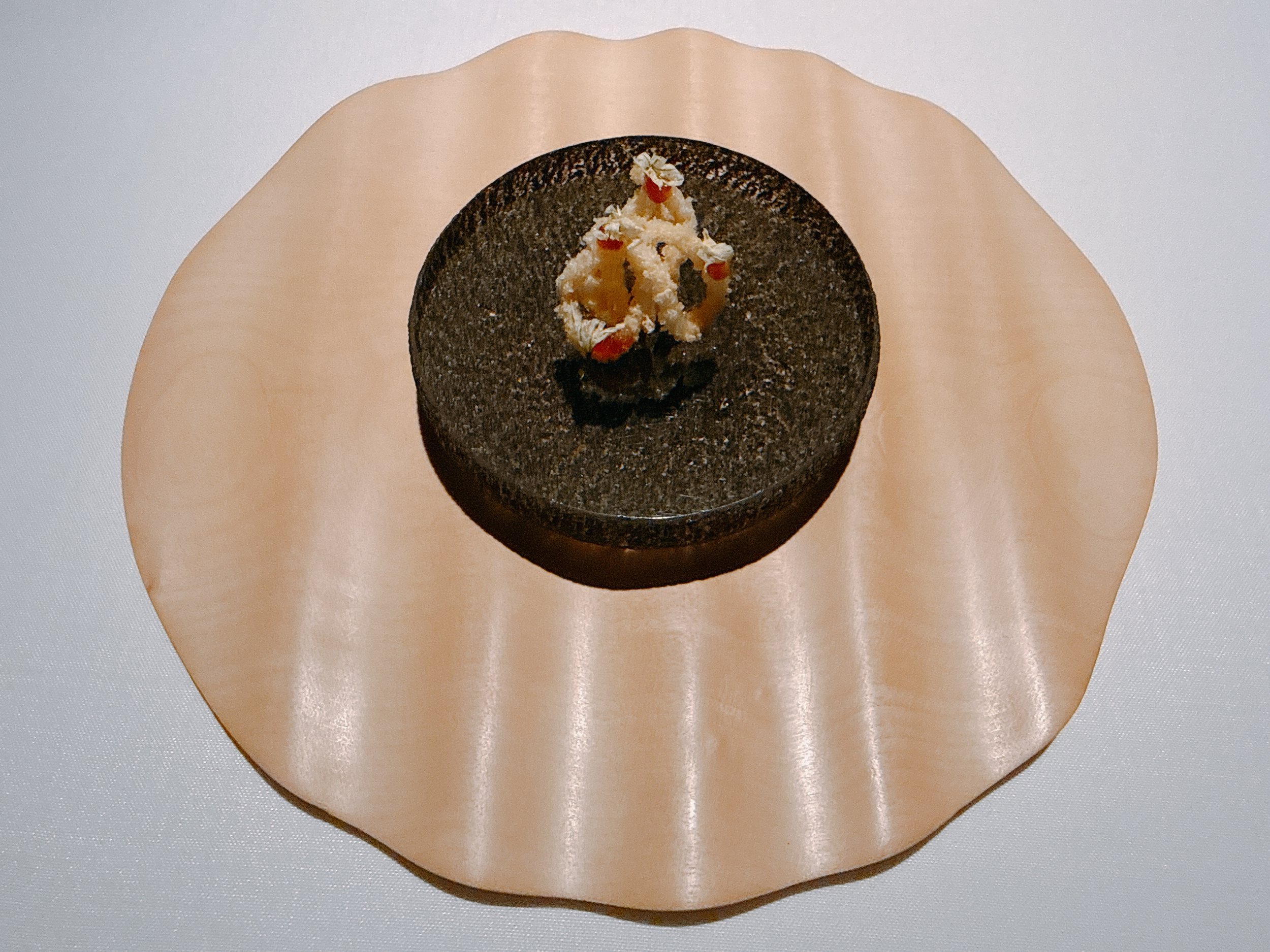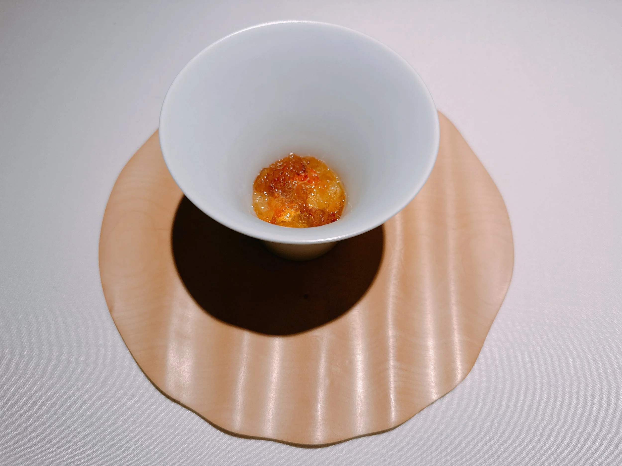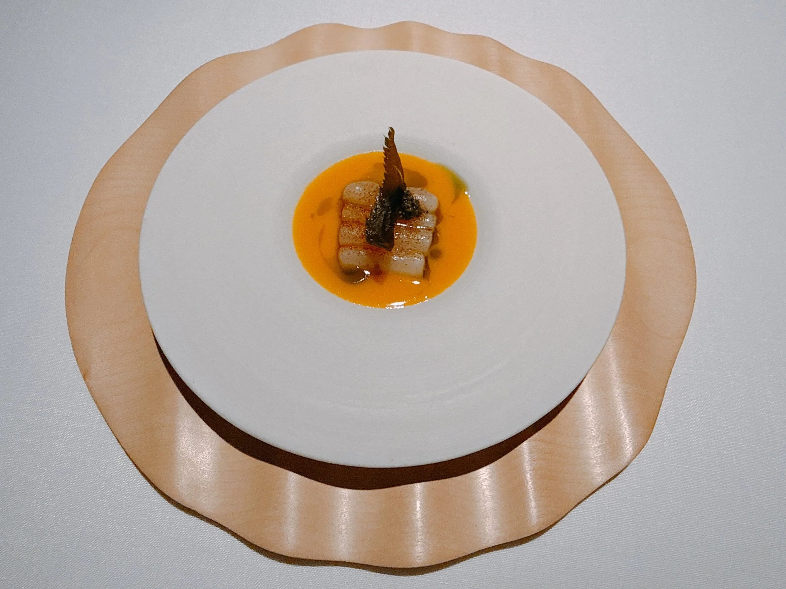 Scallops from Hokkaido had been cooked over the fire, cut into bite-size pieces, and then served with a sauce made from fermented squash, cherry leaf oil, cypress seeds, and a crispy cherry leaf on top. The scallops were perfectly cooked and very tender. The sauce was even better: flavorful, complex, with notable acidity, and only a light squash flavor (and therefore not too much sweetness). A winner, and the first clear sign why Michelin gave this restaurant two stars 18.
