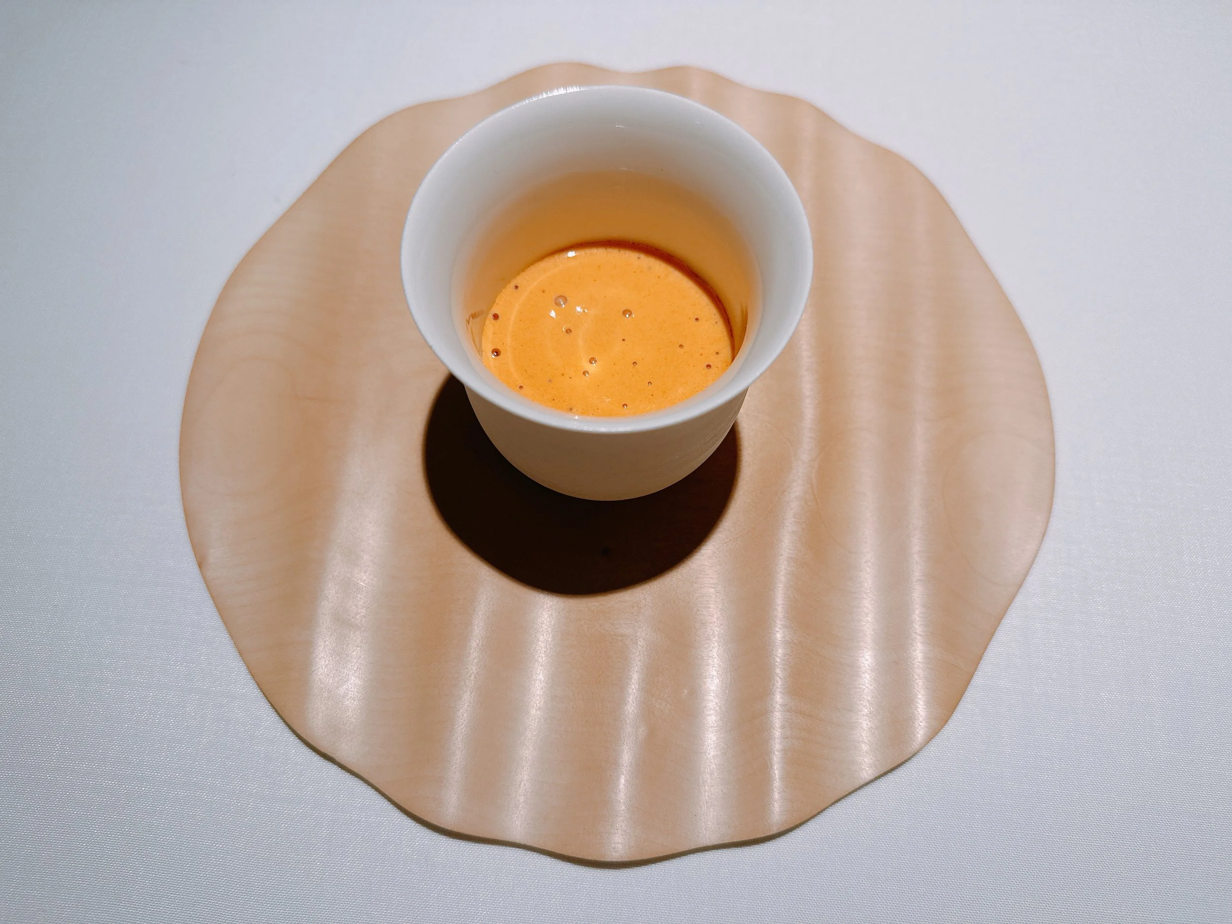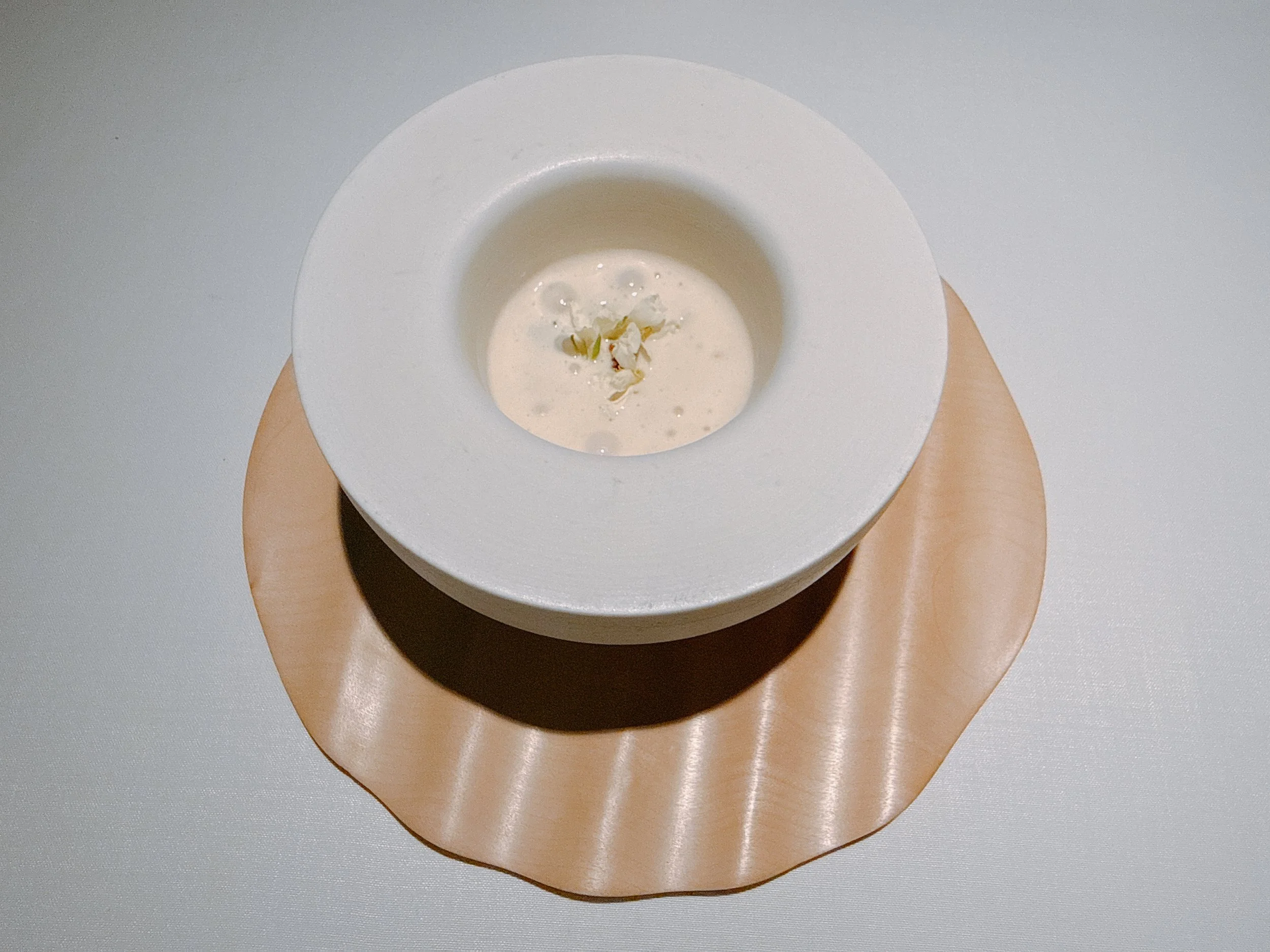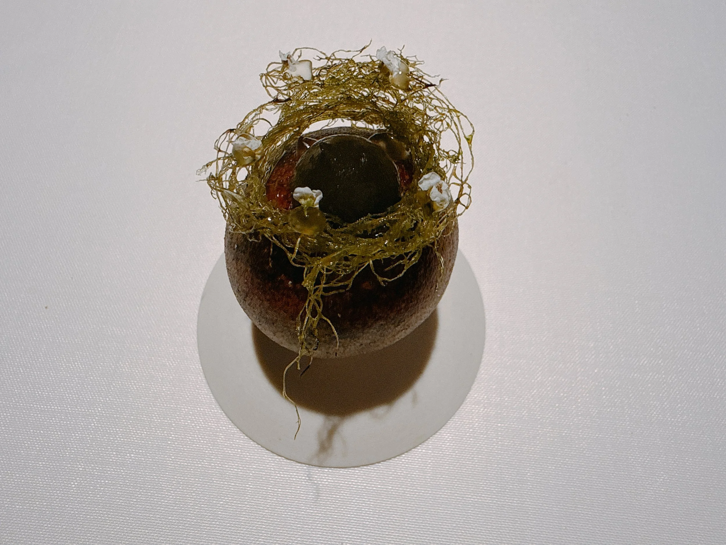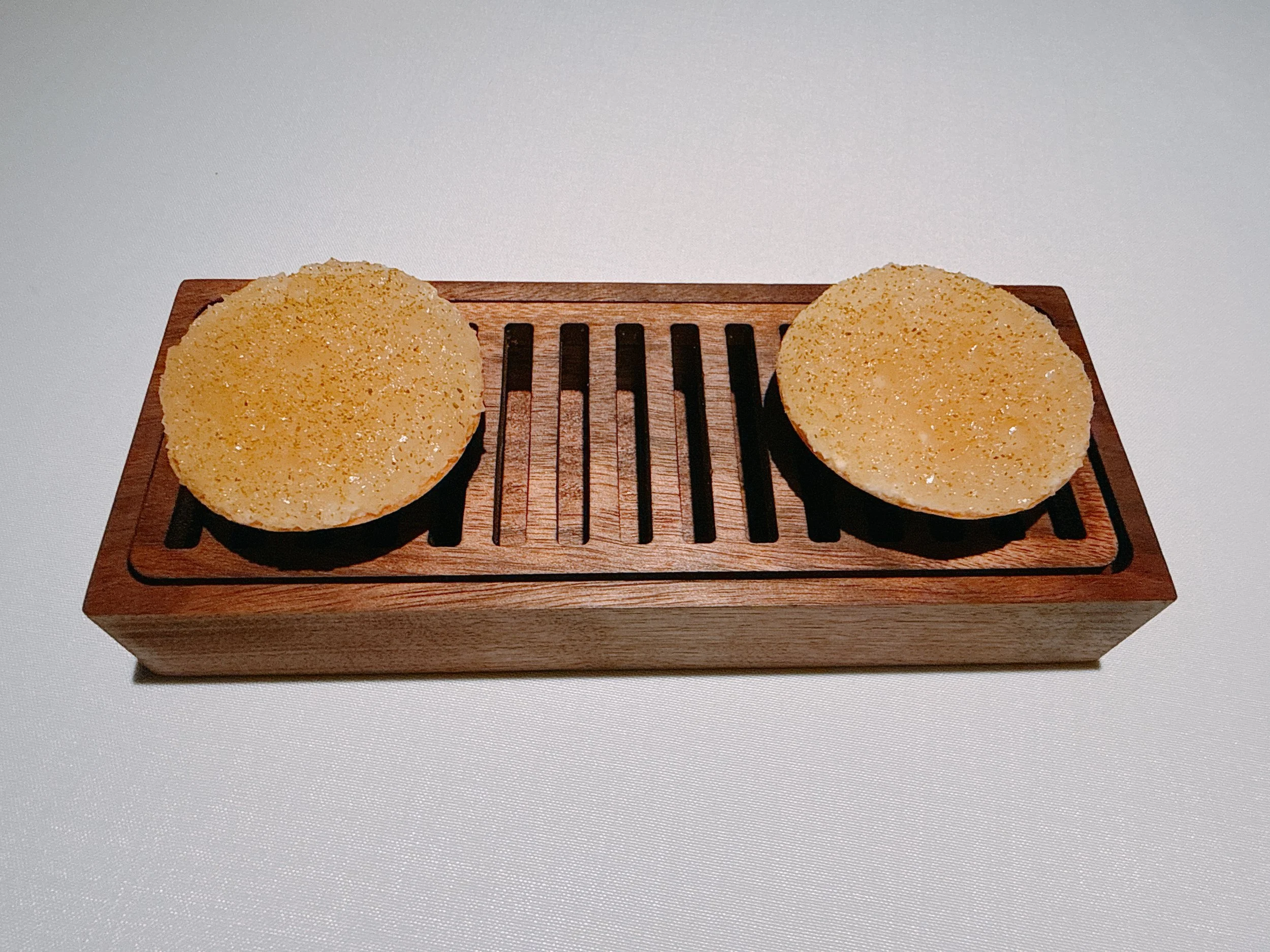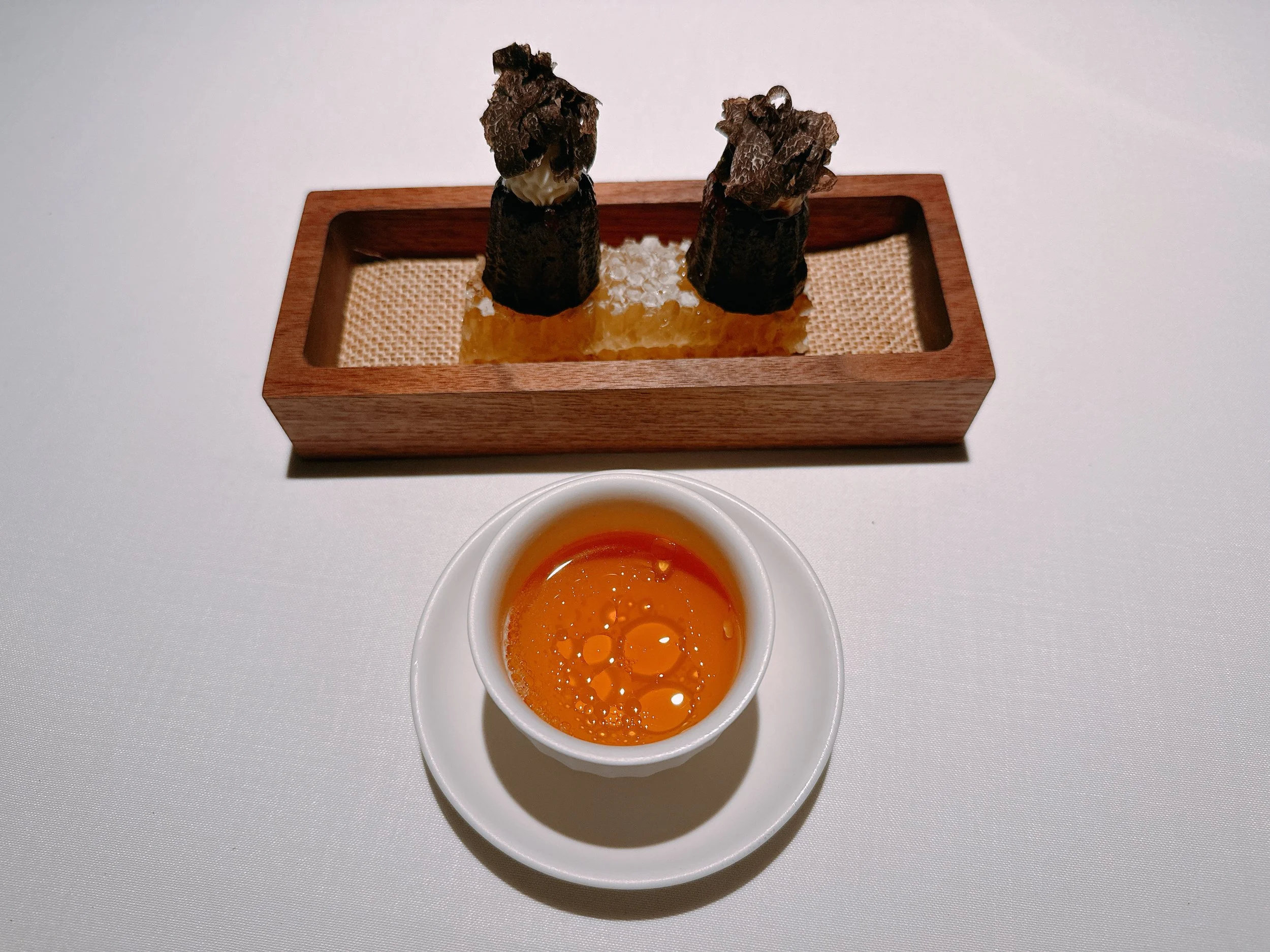 It turned out that there was one more savory bite. A canelé made with roasted celeriac was topped with cows milk cheese, truffles, honey and Iberico ham. It came with a cup filled with a broth made from Iberico ham bones and koji oil. The broth was quite nice, porky and fatty (maybe a 16 by itself). The canelé had light flavors of truffles and ham, paired with the creaminess of the cheese. The flavors didn’t fully come together for me, but the bite was quite good when eaten with the broth 15.