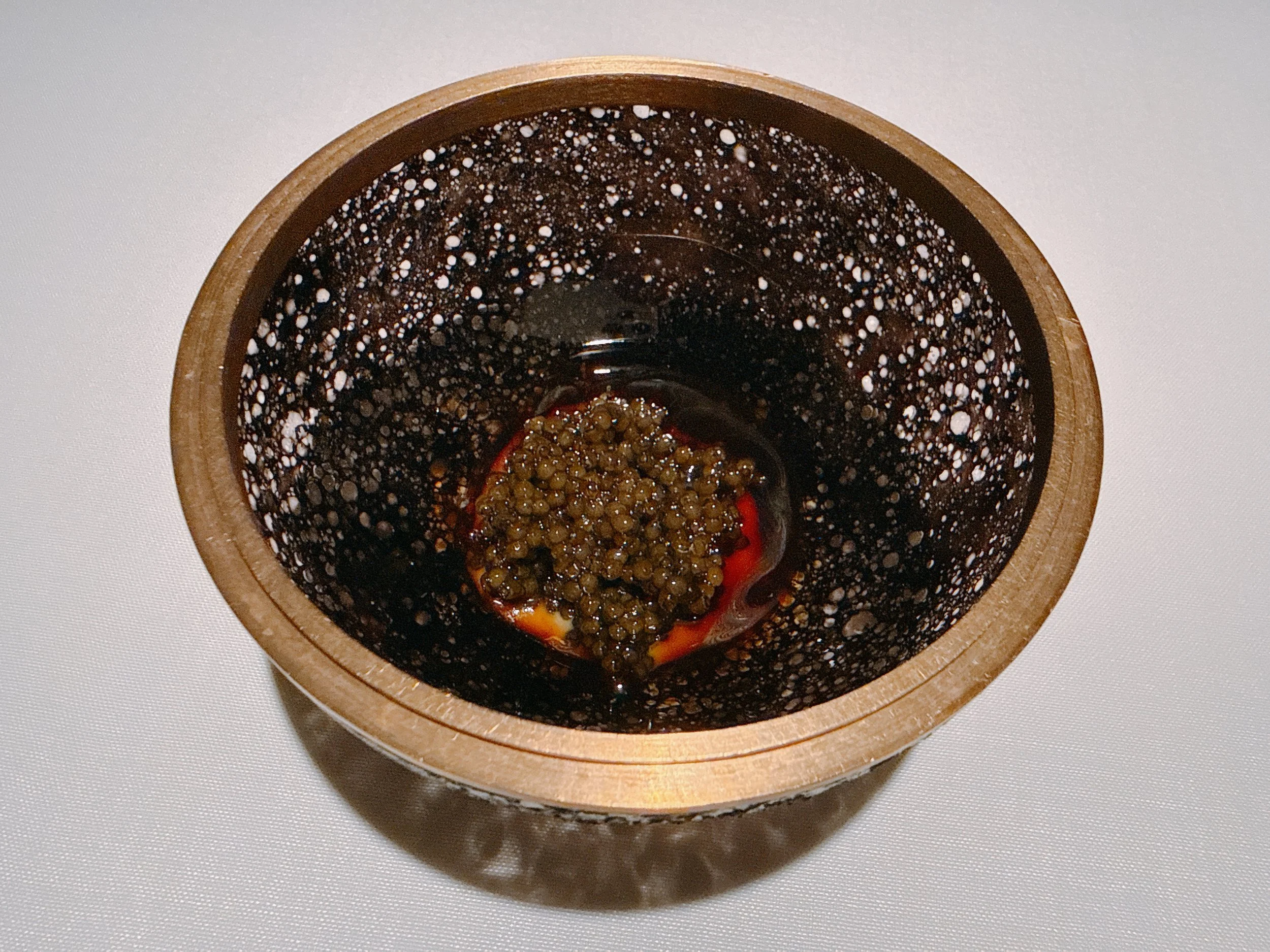 Black cod that had been poached and then finished over the fire was served with caviar, geoduck clams, a kombu vinegar, and a sauce made from fish bones and sake lees. The fish was cooked nicely - very tender, practically melting in the mouth. Oddly, the fish filet had a part that was very gelatinous, maybe from the fat under the skin? Not that bad, all things considered, but unexpected. The geoducks were crunchy, but that was apparent only when they were eaten by themselves. Otherwise, just like the caviar, they were overwhelmed by the rest of the dish. That was partly due to the lovely, complex sauce that was lightly sweet (from the lees, presumably). Nitpicks: the sauce was great, but a step down in intensity from the previous dish. Also, the fish was served only lukewarm - a tad warmer would have been even better 17.