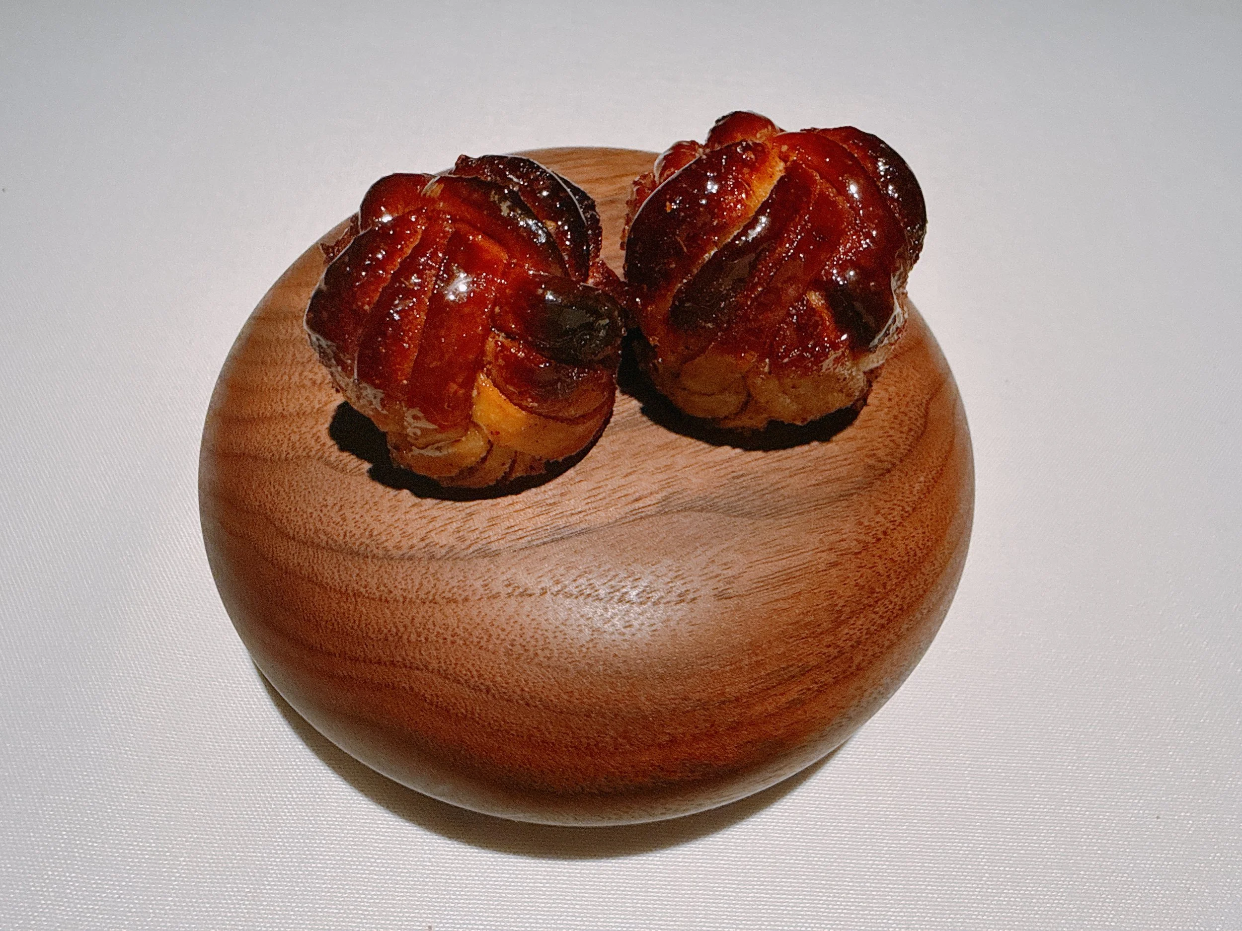 The next serving was a sequel-of-sorts to the pork course. We received slices of a Basque-style sausage seasoned with espelette pepper and a dough ball filled with a combination of blood sausage, reindeer moss, and chanterelle mushrooms. The sliced sausage was essentially spicy chorizo with a good flavor 16. The blood sausage was more muted tastewise, and the enclosing dough shell was much more substantial than the fillings. The resulting heaviness and the somewhat Christmassy flavoring of the dough made me prefer the chorizo 15.