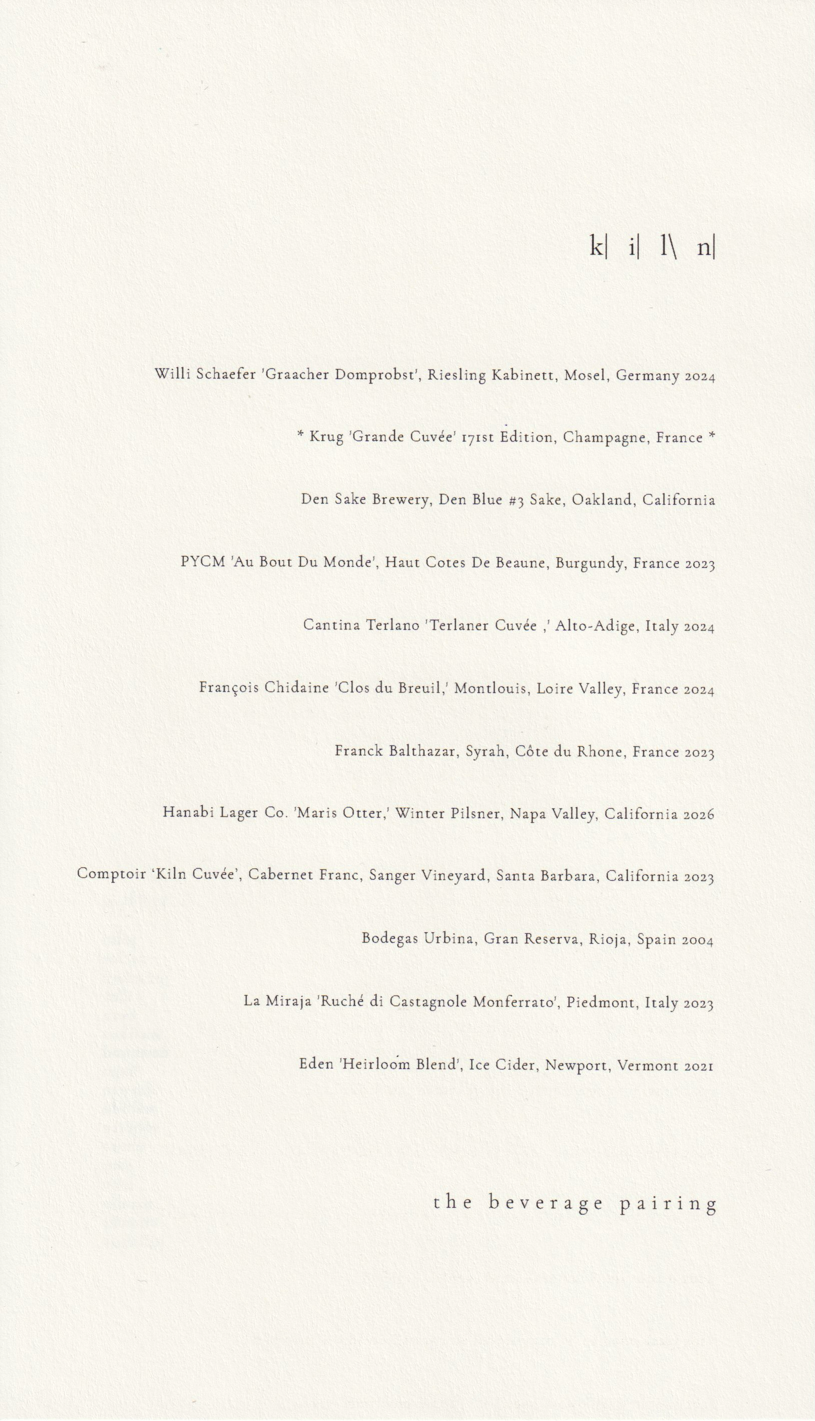 Kiln served a single tasting menu of about twenty courses for $305, with the option (on our visit) to add an additional caviar course for $95. Three beverage pairings were also available: two nine-glass wine pairings for $165 and $350, respectively, and a non-alcoholic pairing for $135. I tried the lower-priced “wine” pairing, which actually also included one glass each of sake, beer, and cider. The wines were all quite good and fit the food well. The corresponding bottles would generally have retailed in the $40-$50 range, making this a typical bang-for-the-buck among wine pairings. Ordering by the bottle would obviously be more cost-effective.