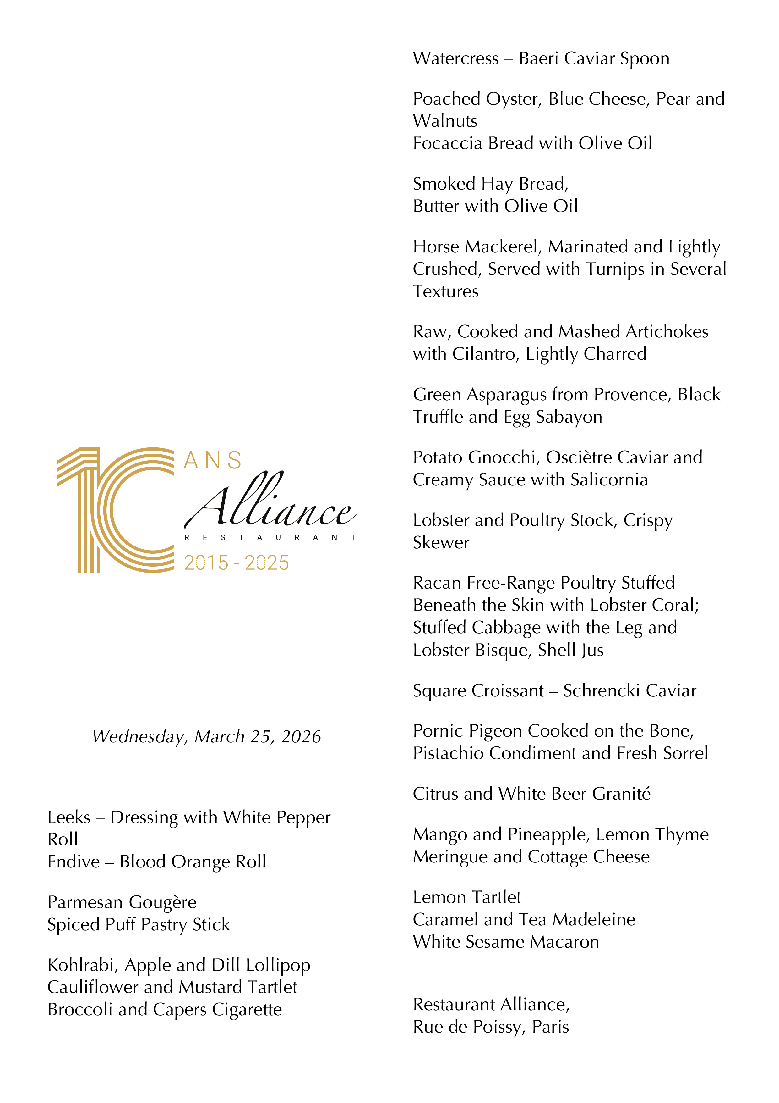 When: Dinner for 1 on 25 March 2026