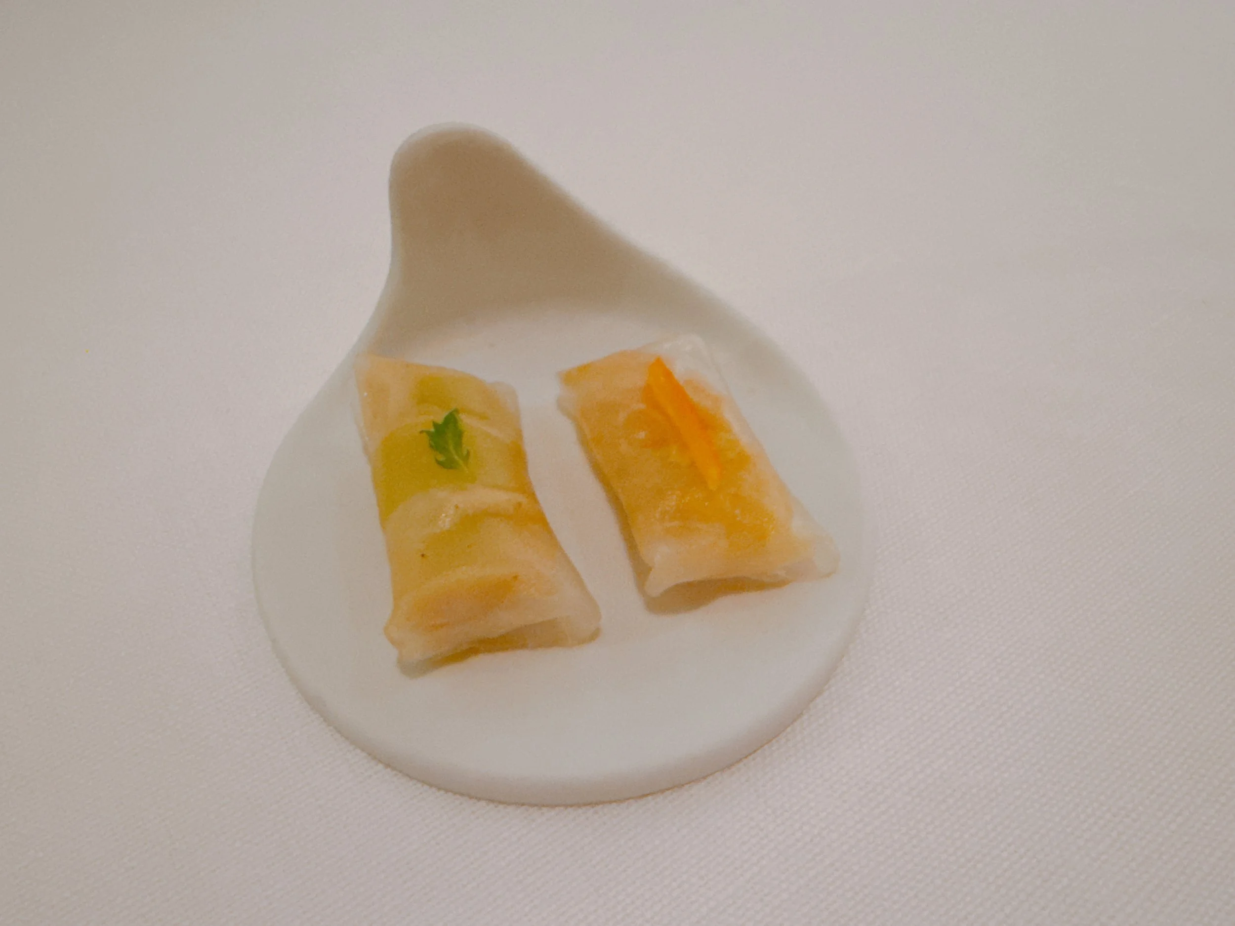 Since the wine pairing started only with the main part of the tasting menu, there was an opportunity to order an aperitif to go along with the appetizers. The first pair of them looked like little dumpling rolls. One was topped with a little leaf and filled with leeks. Its nicely done, chewy wrapper enclosed a filling that was a bit light on taste, but had enough acidity and freshness to make for an elegant bite 17. The other roll was prepared with blood oranges and endives, which made for a crunchy, somewhat bitter filling 15.