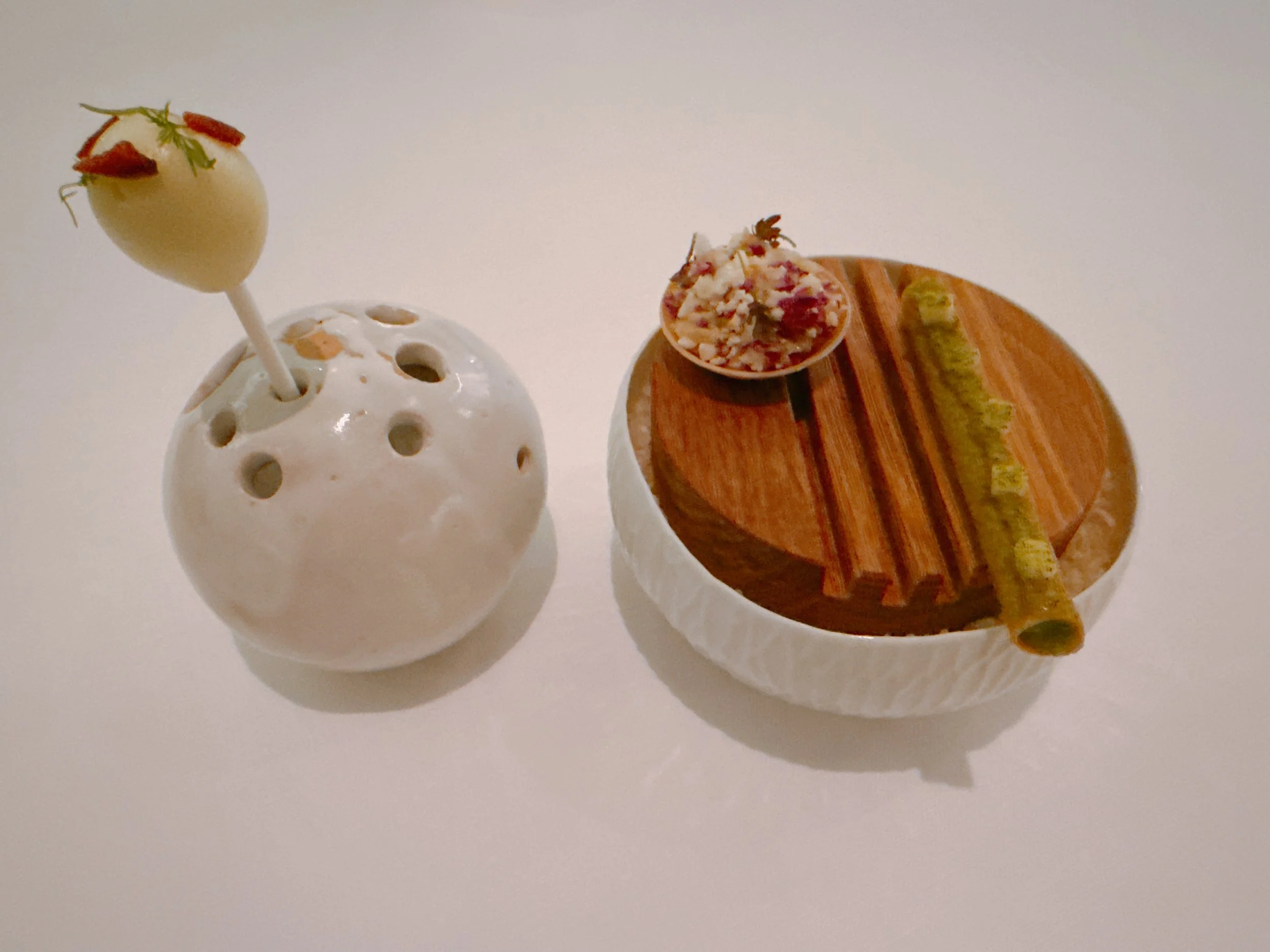 Three more bites arrived soon thereafter. A “cigar” made from broccoli and capers had a very lightly flavored filling - it would have been hard to guess what the ingredients were. There was no acidity either - apparently, these were not pickled capers 14. A little tartlet was filled with various kinds of cauliflower and some mustard seeds. The cracker shell here was very crunchy, on the verge of being too hard to eat. The cauliflower was almost raw, with a crumbly texture and only a faint flavor 14. Finally, there was a lollipop made with kohlrabi, apple and dill. It had a foamy exterior, a crunchy center (the kohlrabi, I presume), and a hint of dill flavor - easily missed if one wasn't looking for it 15.