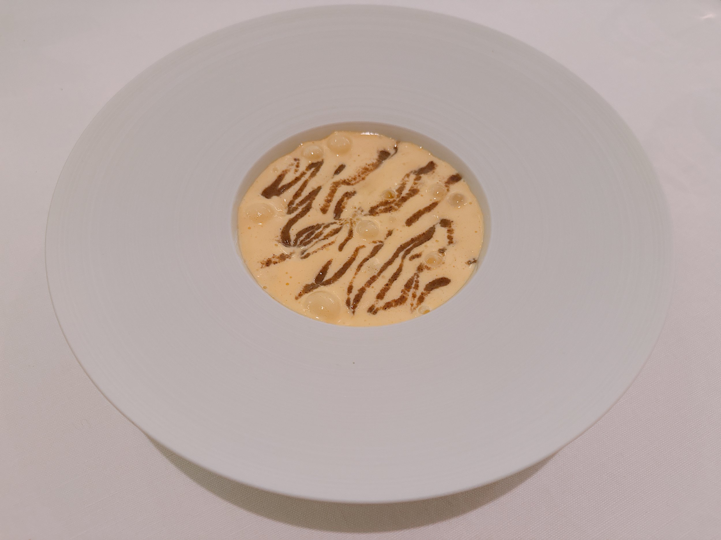 Then it was time for the optional course. Green asparagus pieces were topped with a white sabayon that had been drizzled with a black truffle sauce. Tableside, a asparagus velouté was added, disappearing below the sabayon - a bit like the sauce poured into a soufflé. There were some similarities to the preceding course - both had green vegetables hidden under a moussy sauce. And in both cases, most of the flavor came from the mousse (or sabayon in this case). The crunchy fresh green asparagus pieces didn't have too much flavor by themselves, and even the truffle taste was pretty light. But the sabayon was quite good, and I actually preferred this dish slightly over the artichoke course 15.