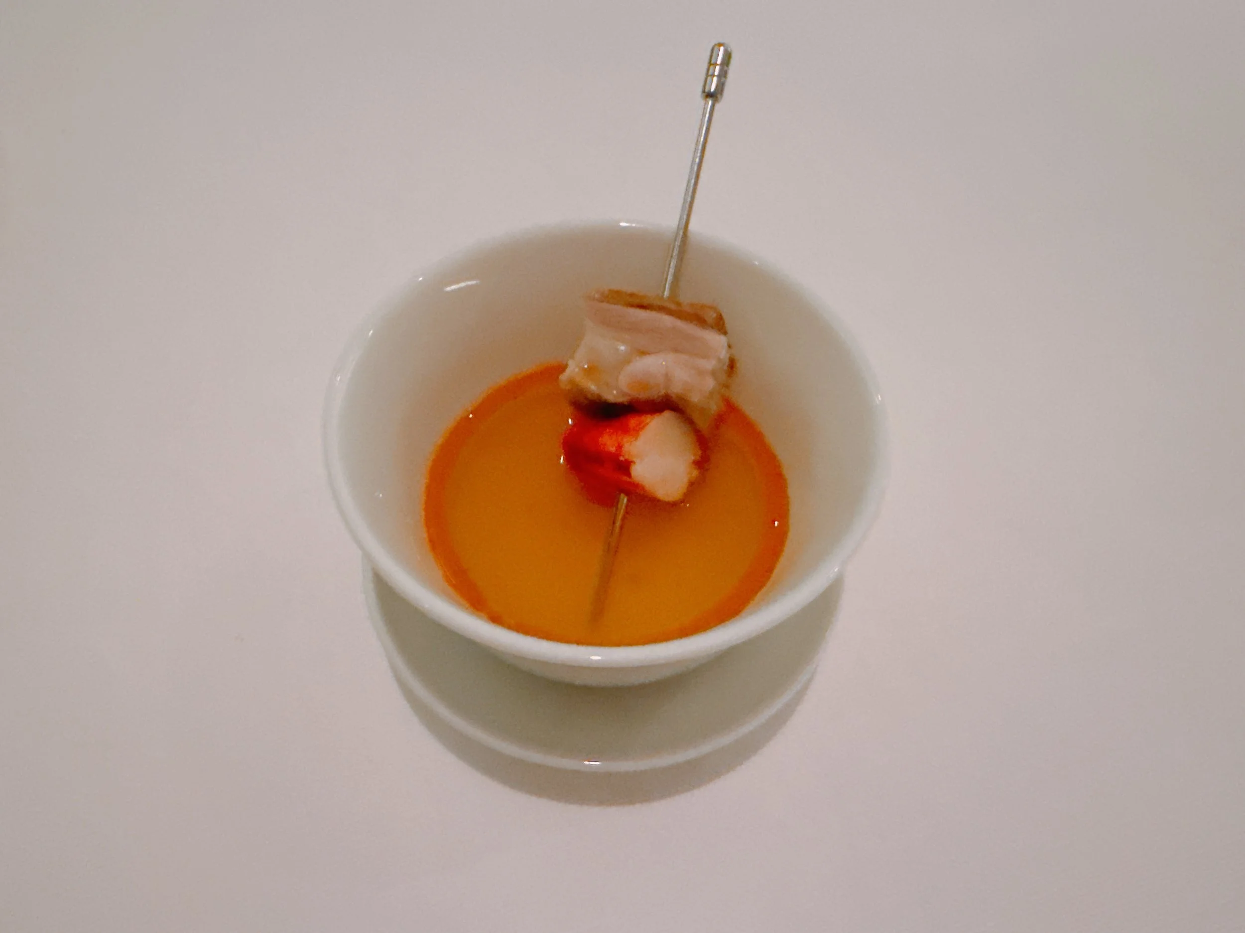 Following was one of the signature dishes of the restaurant - chicken. What made it special was that prior to cooking, lobster roe and lobster butter were added under the chicken's skin, giving it a light lobster flavor. The chicken was served in two parts. First, there was a cup of lobster/chicken broth along with a skewer holding pieces of lobster and chicken. I tried the skewer first, and the lobster was fine - juicy, but also a bit chewy and not too flavorful by itself. The chicken had more flavor and a crunchy skin. But the best part of the dish was the intensely flavorful broth. Maybe I should have added the lobster and chicken pieces to the broth before eating them? Averaging the phenomenal broth (17 or 18 by itself) and the two less compelling pieces of meat (14), this was a 16.