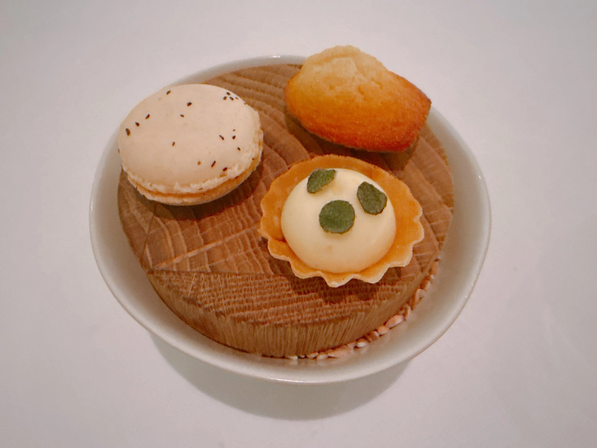 Three petit fours concluded the dinner. A mini apple pie seasoned with sage had a light crunch and a bit of acidity, but I couldn't taste either the apple or the sage 14. A white sesame/vanilla macaroon was nicely executed and had a strong sesame butter flavor 16. Finally, a caramel Madeleine had an almost creamy texture. Yum 16.