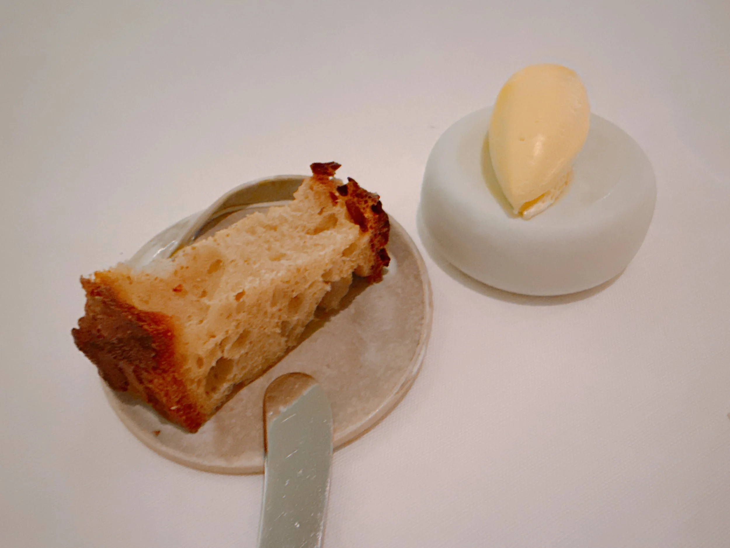 For the remainder of the dinner, we were served slices of smoked hay bread, along with a butter dressed with olive oil. Arriving at room temperature, the bread's crust was chewy rather than crunchy, and it had a pleasant, light flavor 14.
